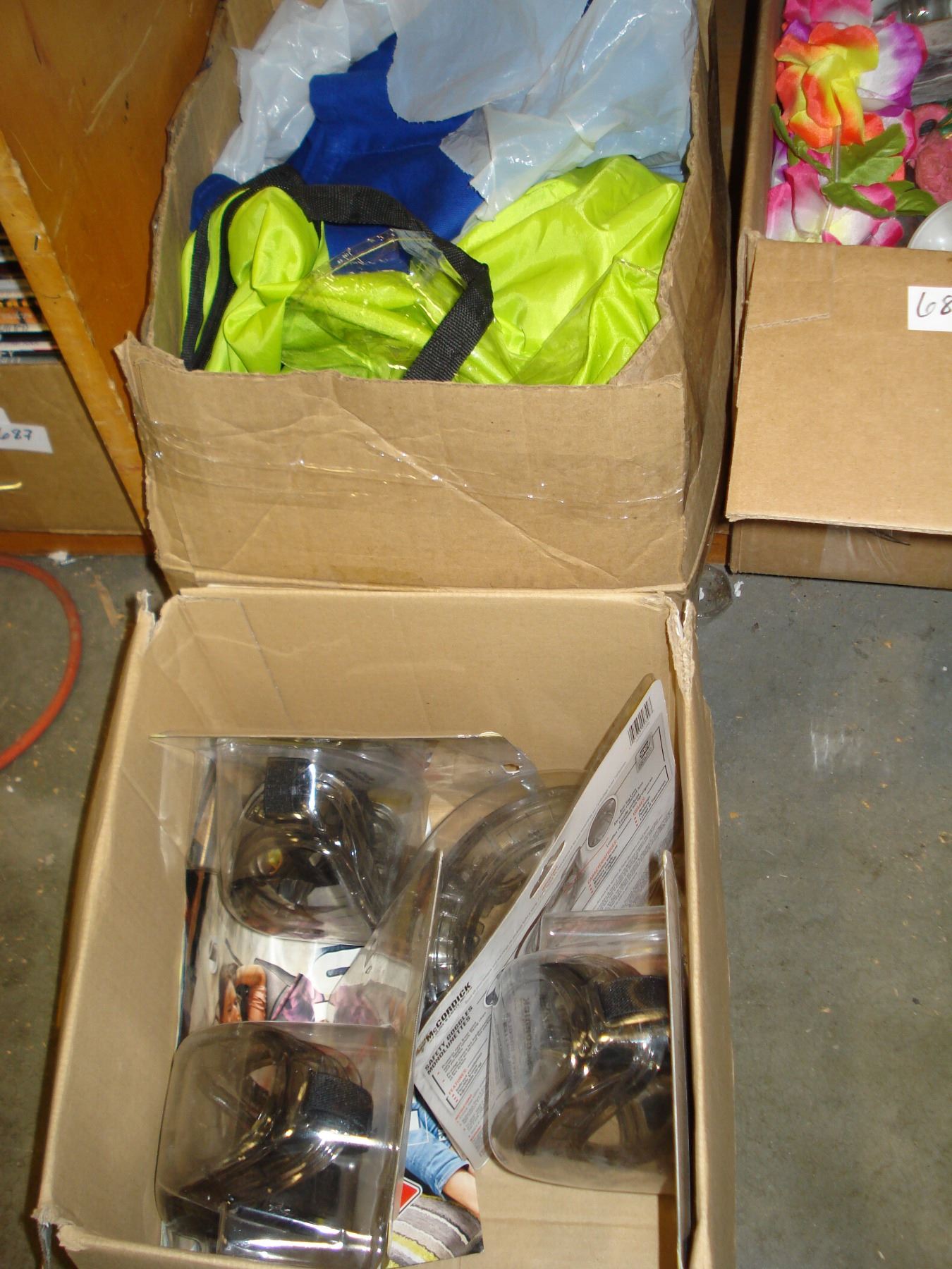 BOX OF SAFETY GOGGLES COVERALLS AND WINTER WEAR GEAR