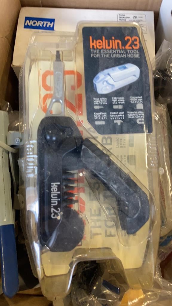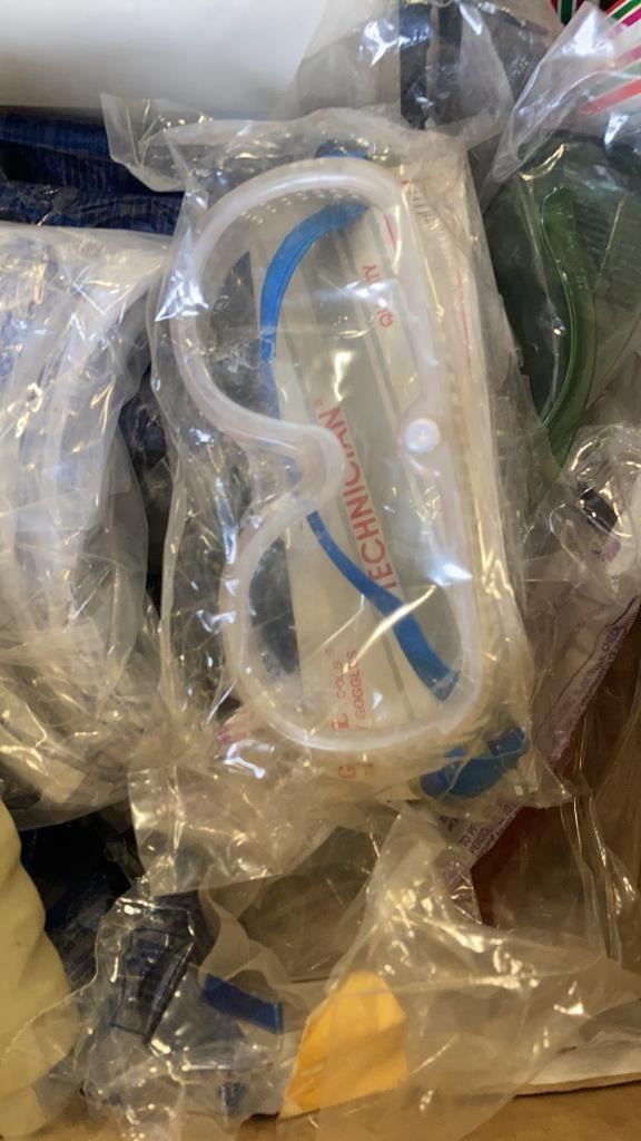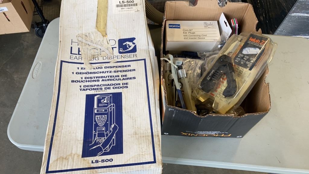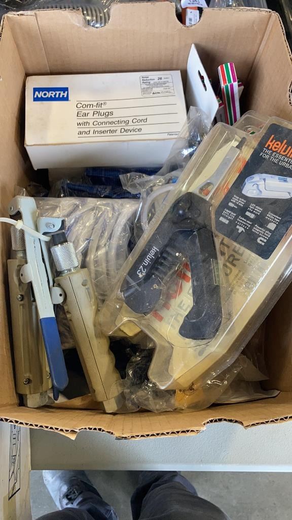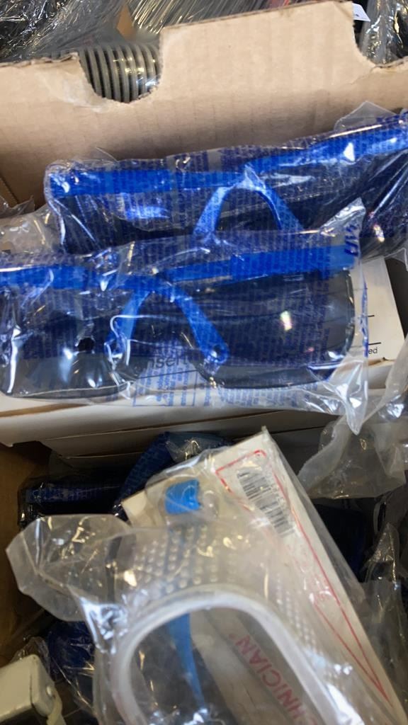 BOX OF SAFETY GOGGLES, KELVIN 23 MULTI TOOL, SNADBLASTING GUN, EARPLUGS, EARPLUG DISPENSER