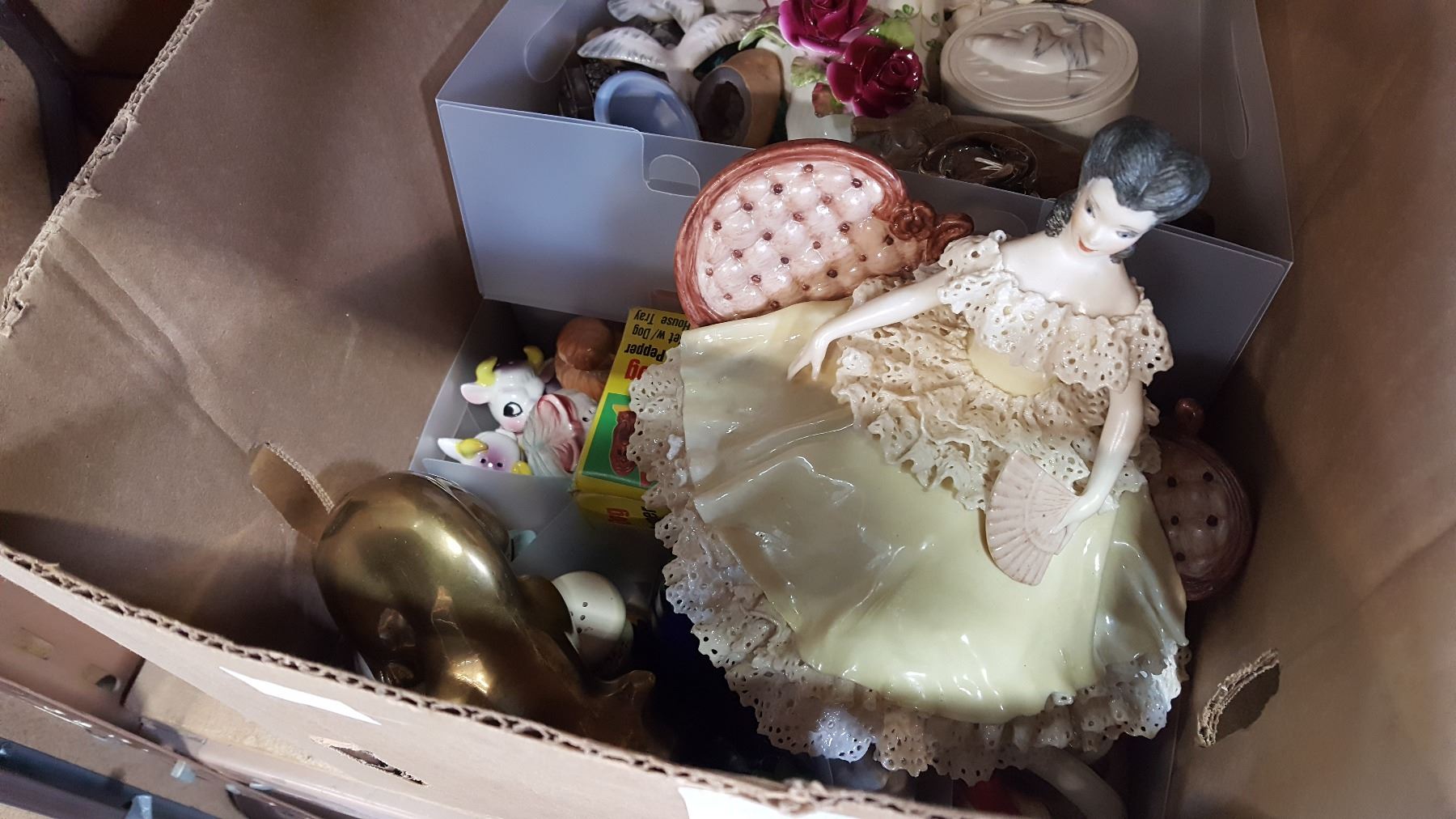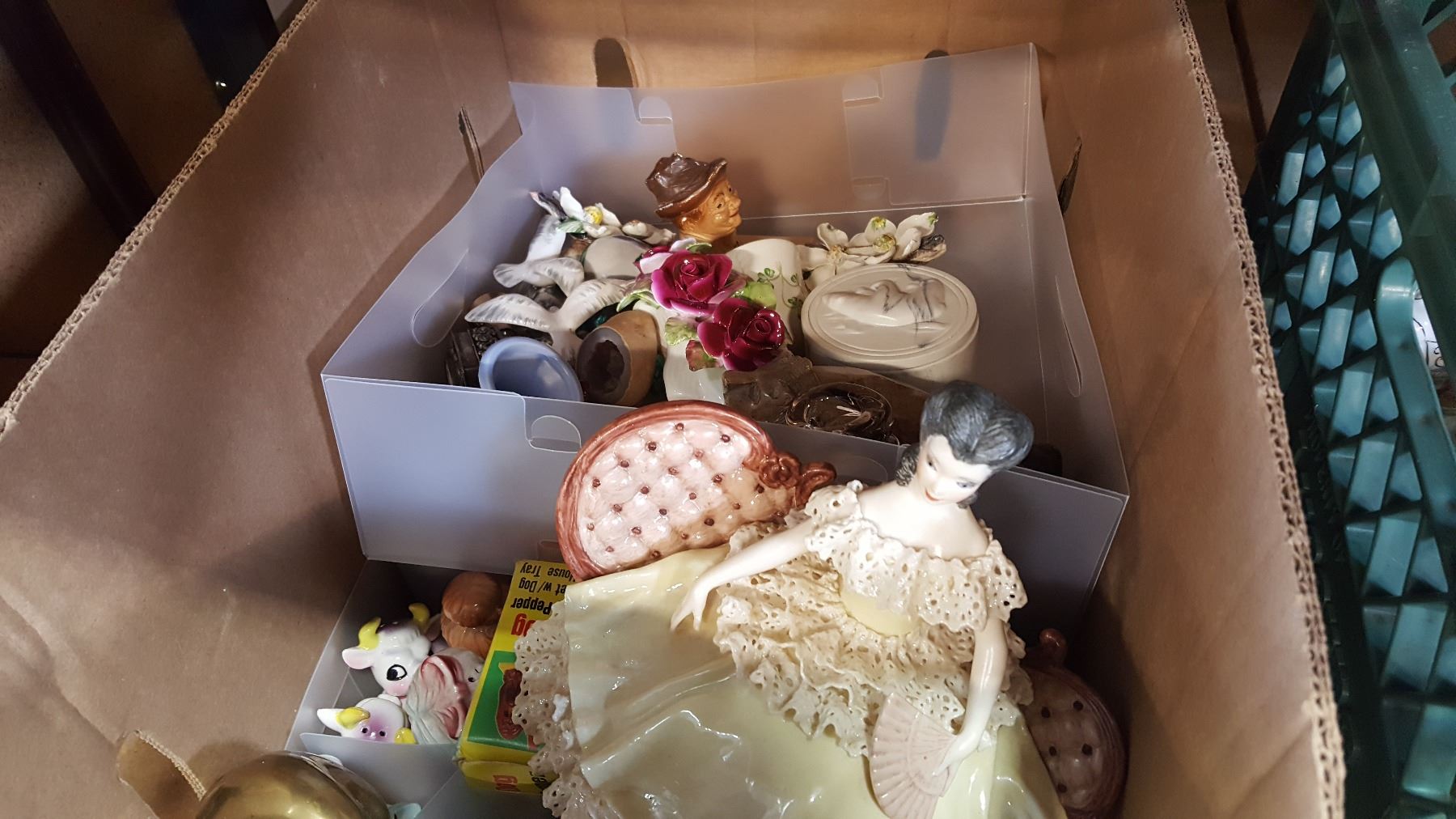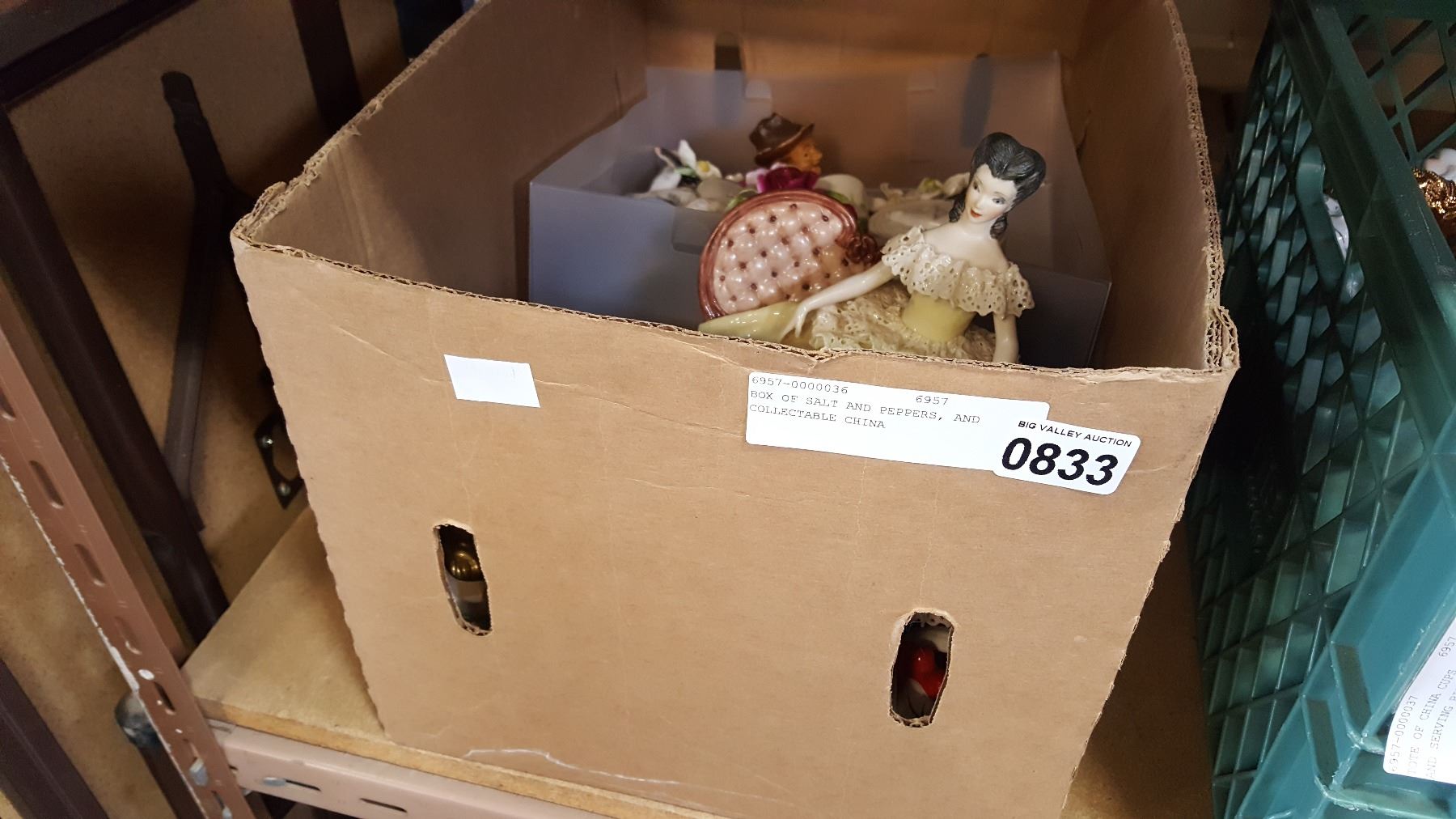 BOX OF SALT AND PEPPERS, AND COLLECTABLE CHINA