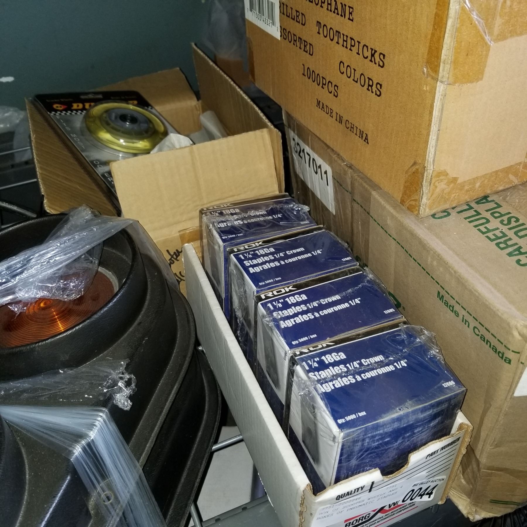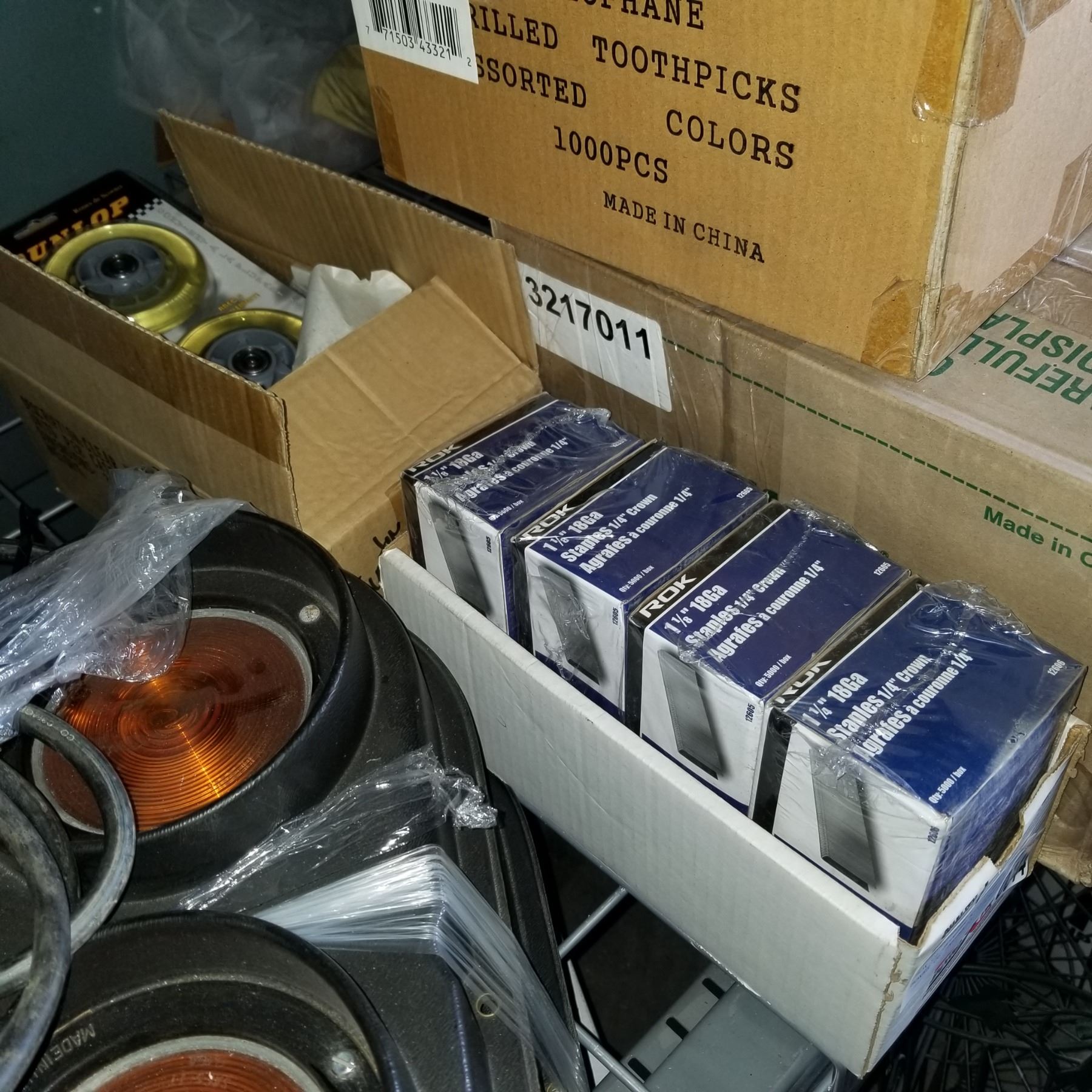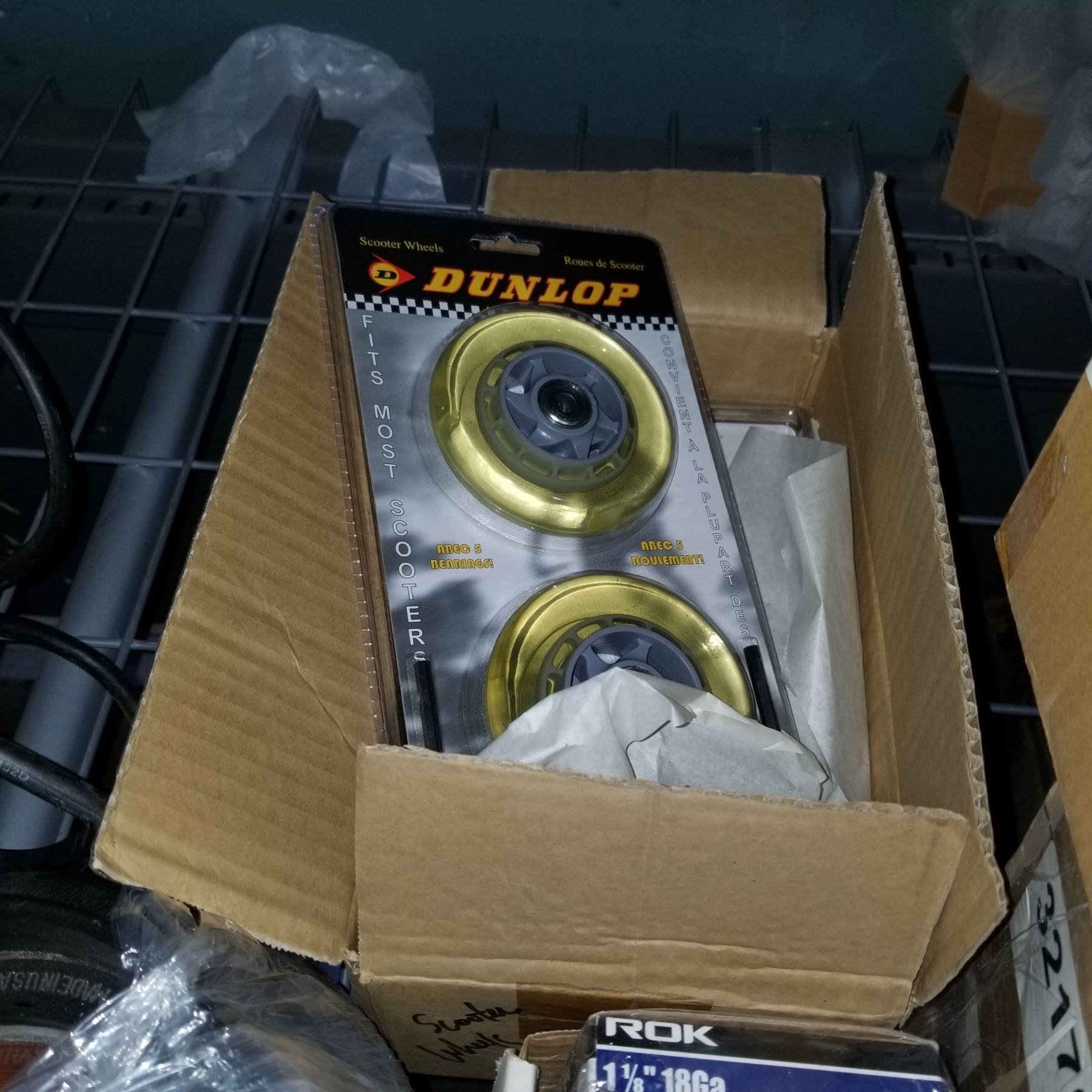BOX OF SCOOTER WHEELS AND 4 BOXES OF PNEUMATIC STAPLES
