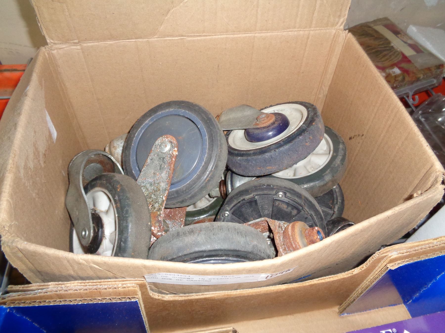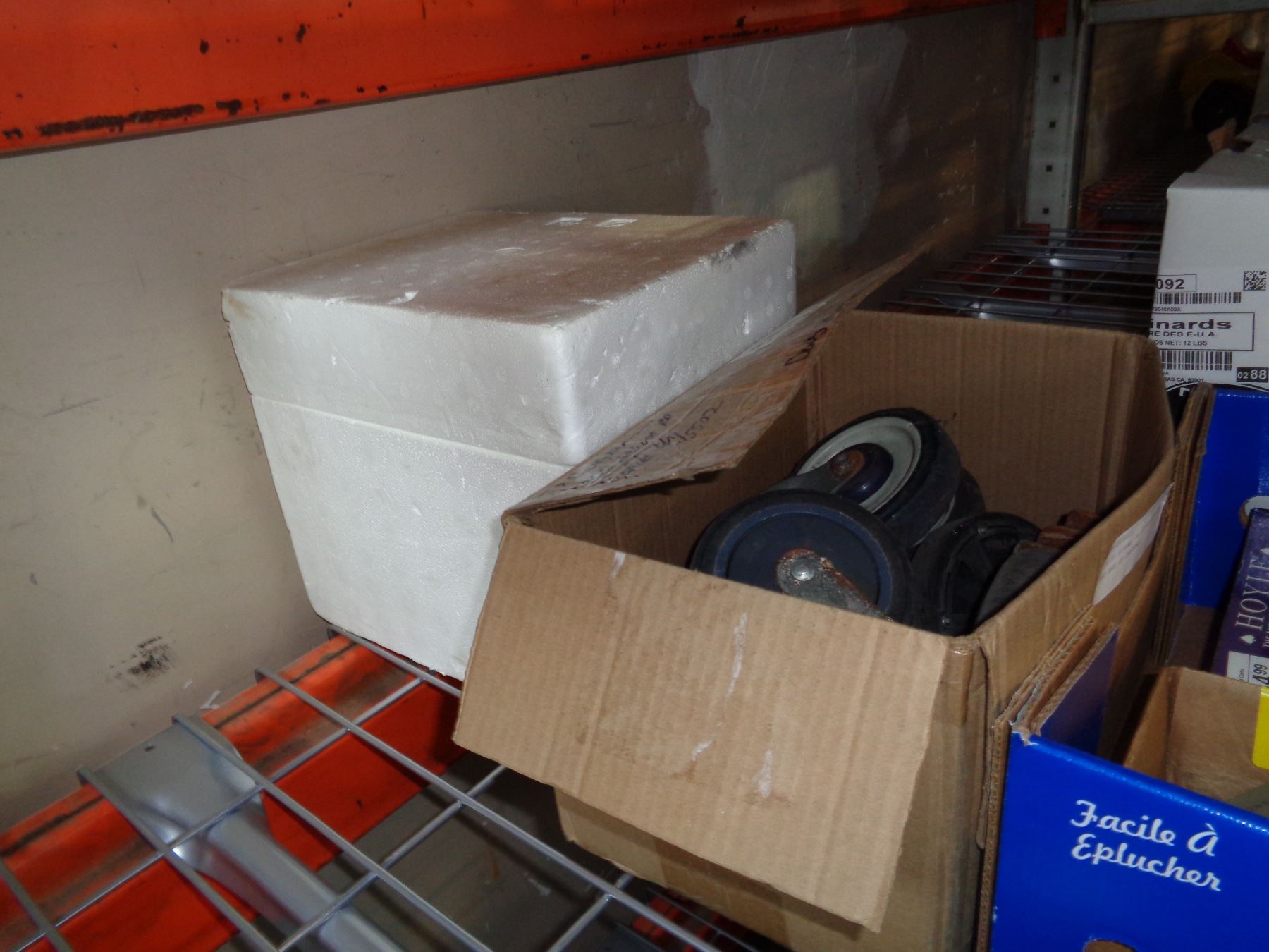 BOX OF SCREWS IN STYROFOAM BOX AND BOX OF CASTORS