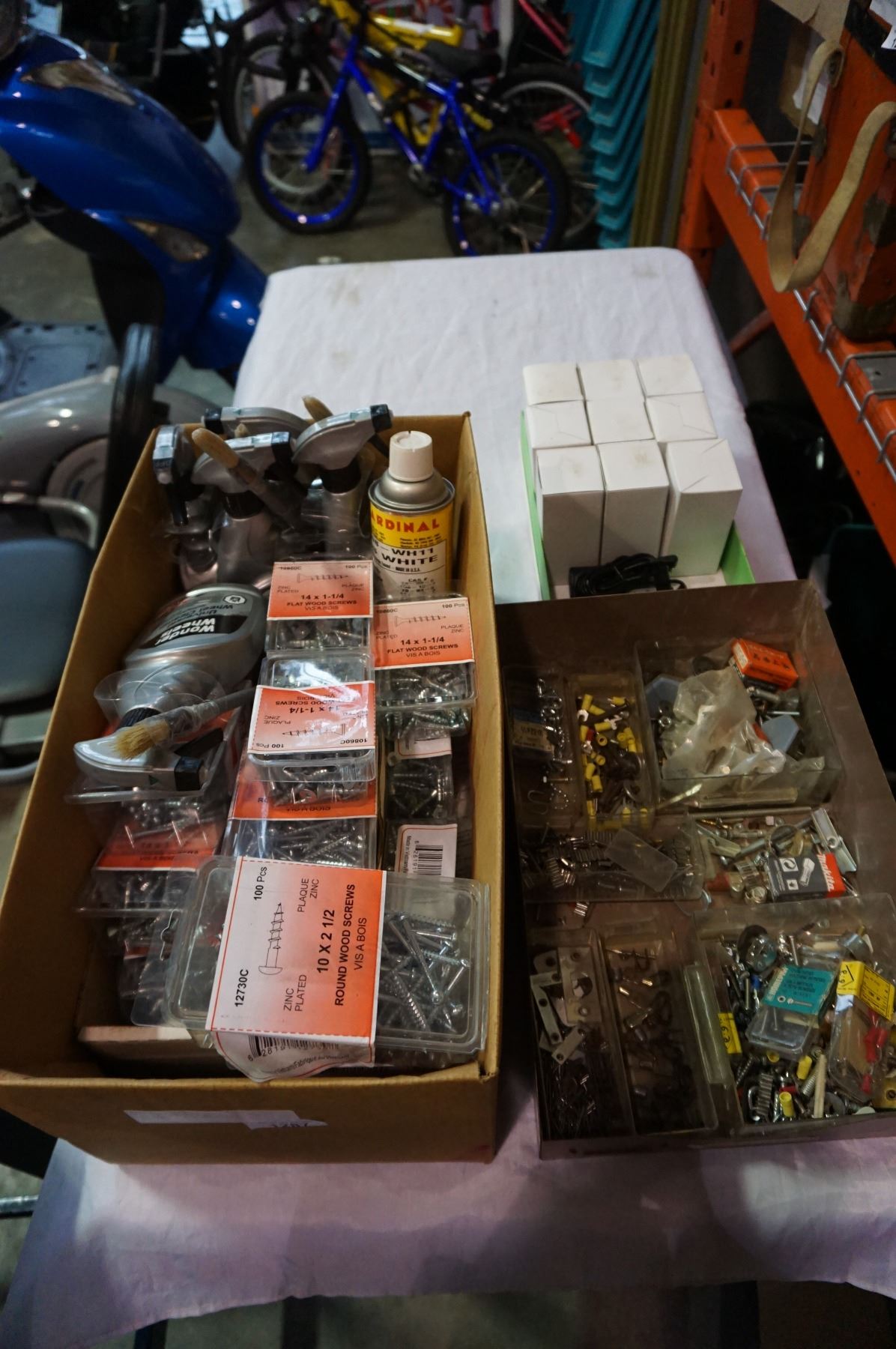 BOX OF SCREWS, WHEEL CLEANER, HARDWARE, AND ADAPTERS