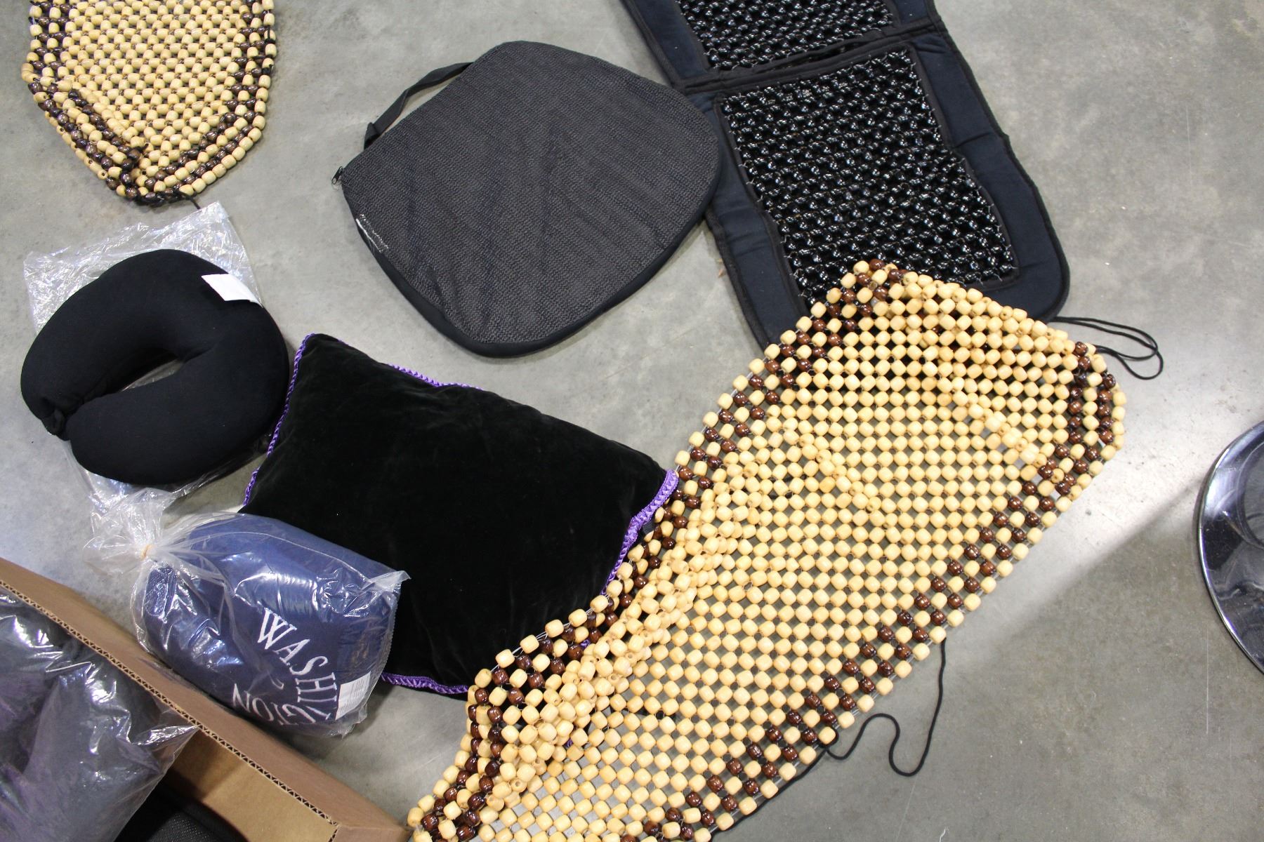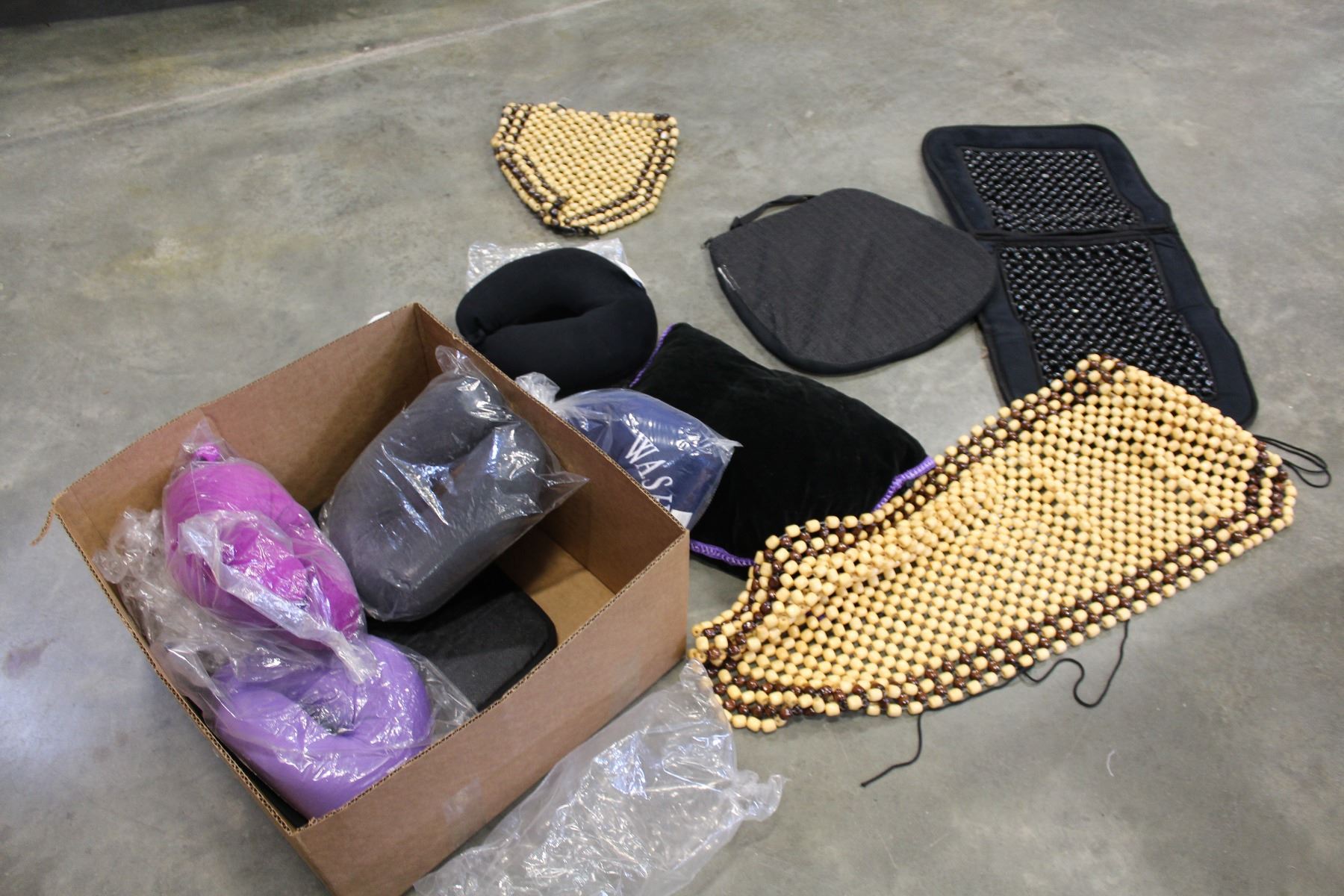 BOX OF SEAT CUSHIONS, NECK PILLOWS AND BEADED SEAT COVERS