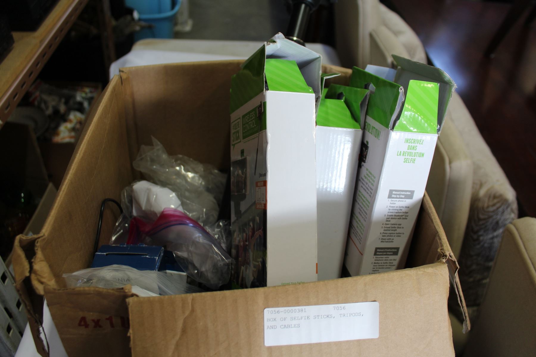 BOX OF SELFIE STICKS, TRIPODS, AND CABLES