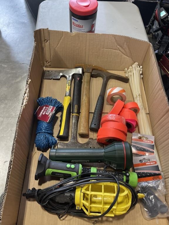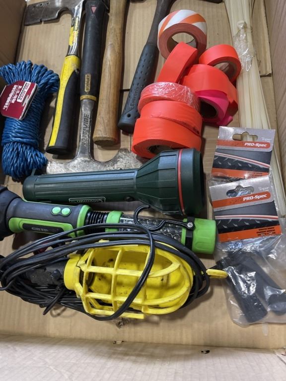 BOX OF SHINGLE HAMMERS, FLAGGING TAPE FLASHLIGHTS AND MORE