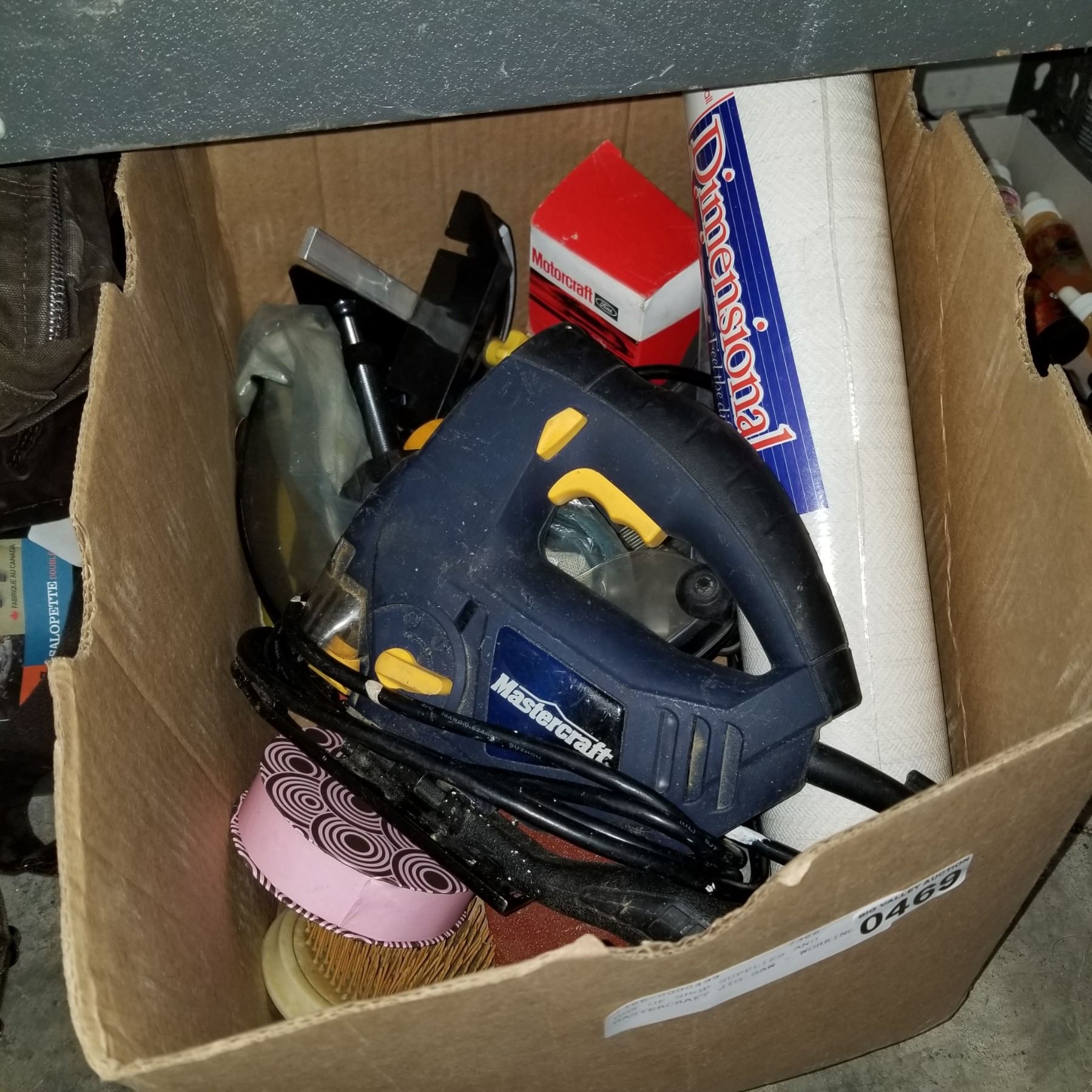 BOX OF SHOP SUPPLIES AND MASTERCRAFT JIG SAW - WORKING