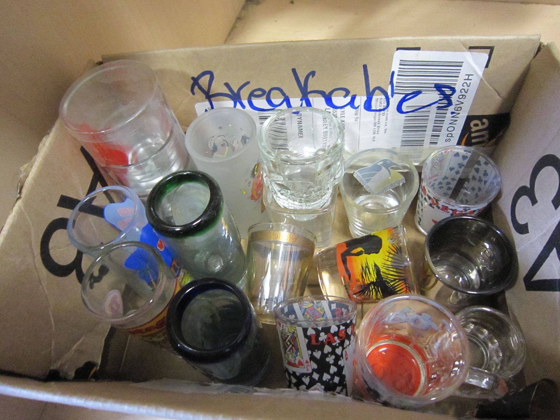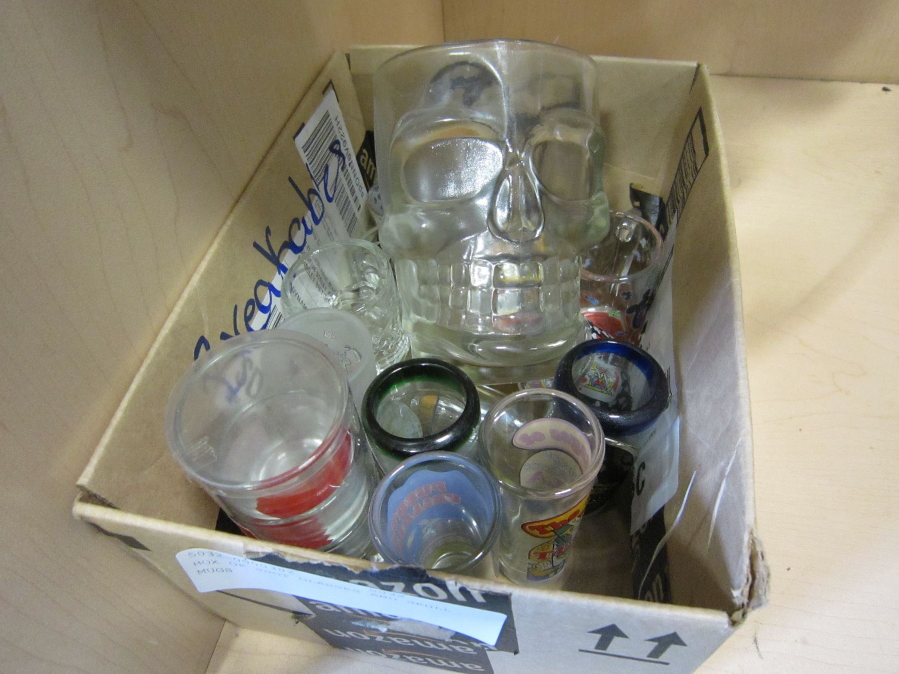 BOX OF SHOT GLASSES AND SKULL MUGS