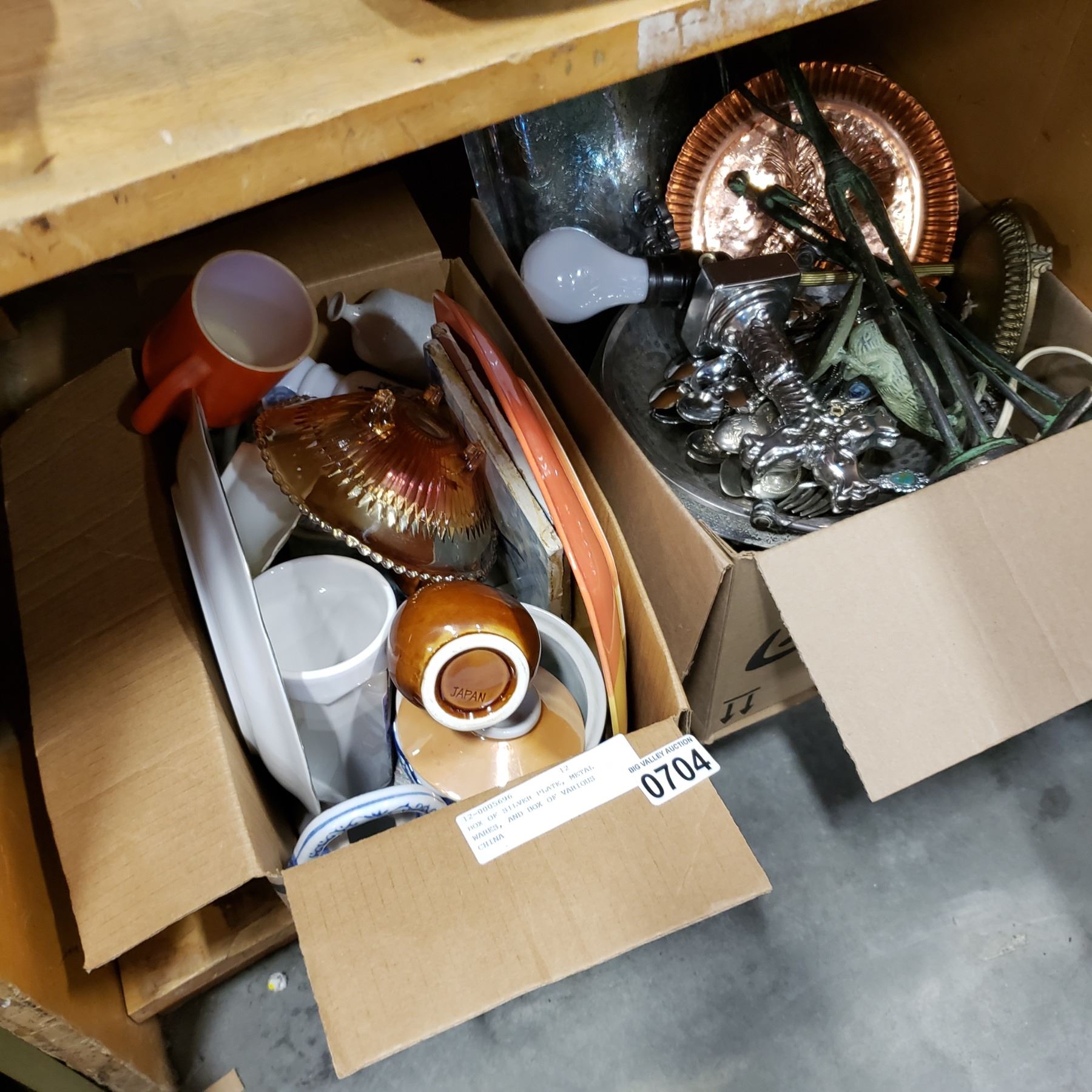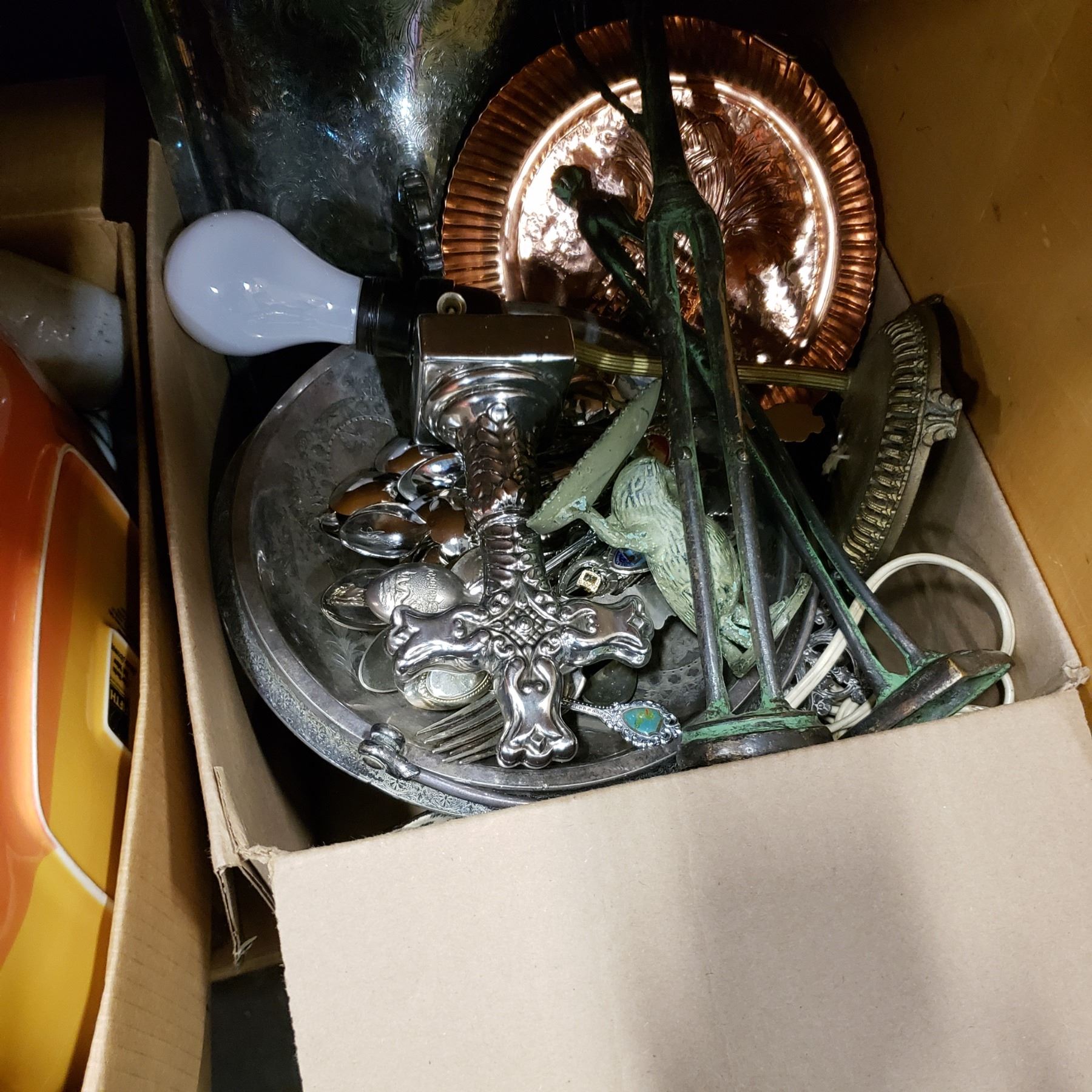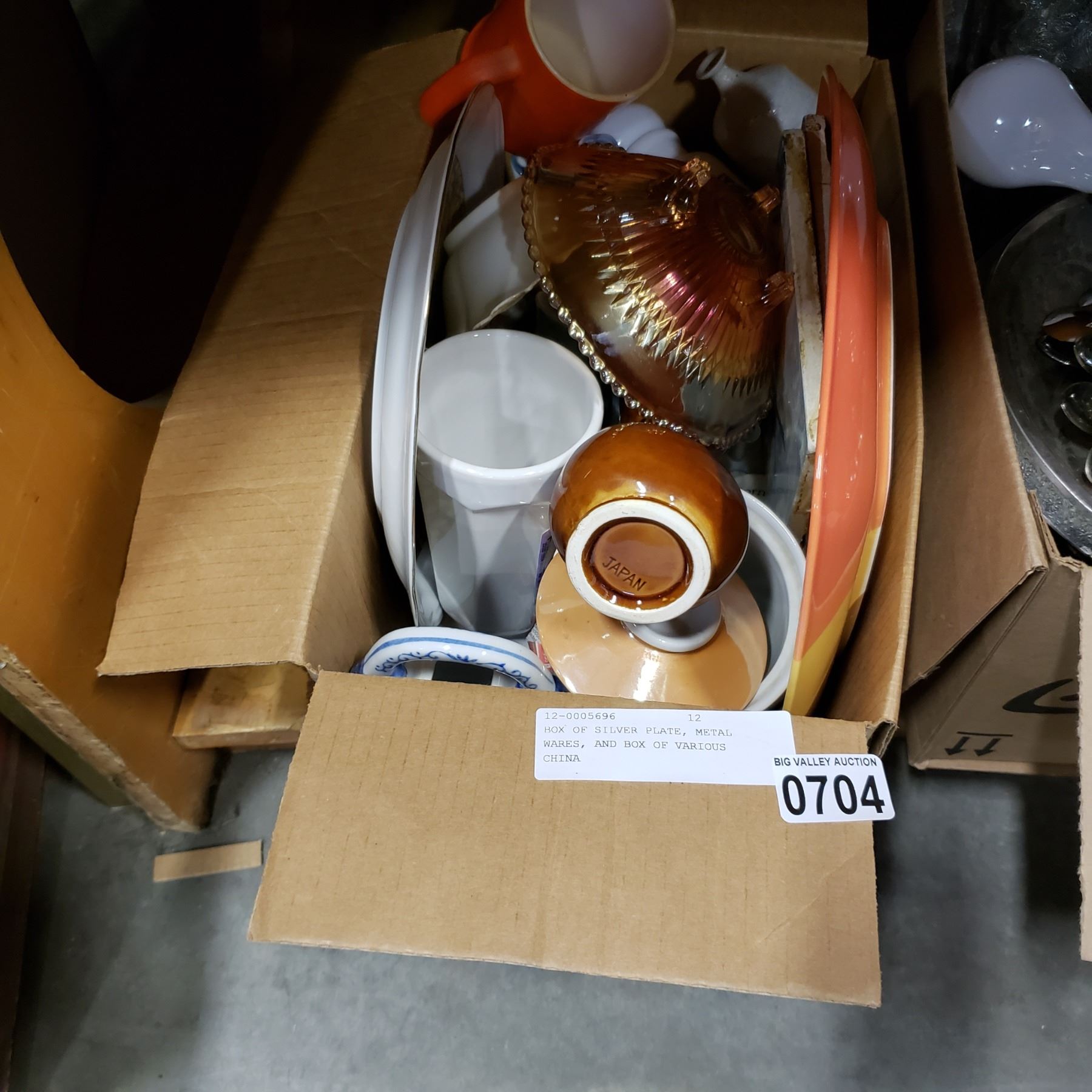 BOX OF SILVER PLATE, METAL WARES, AND BOX OF VARIOUS CHINA