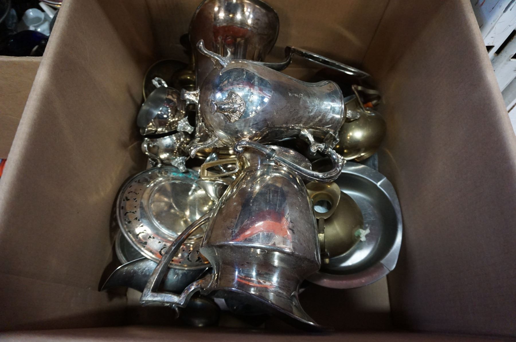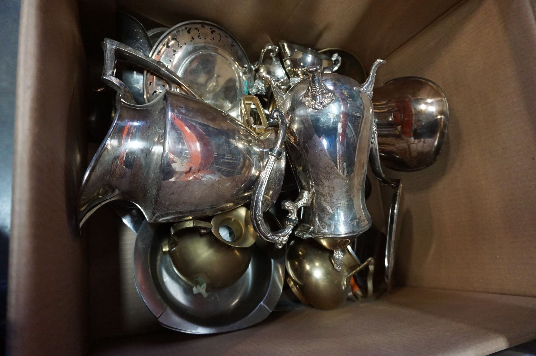 BOX OF SILVER PLATE SERVING PIECES, JUG, AND COFFEE POT