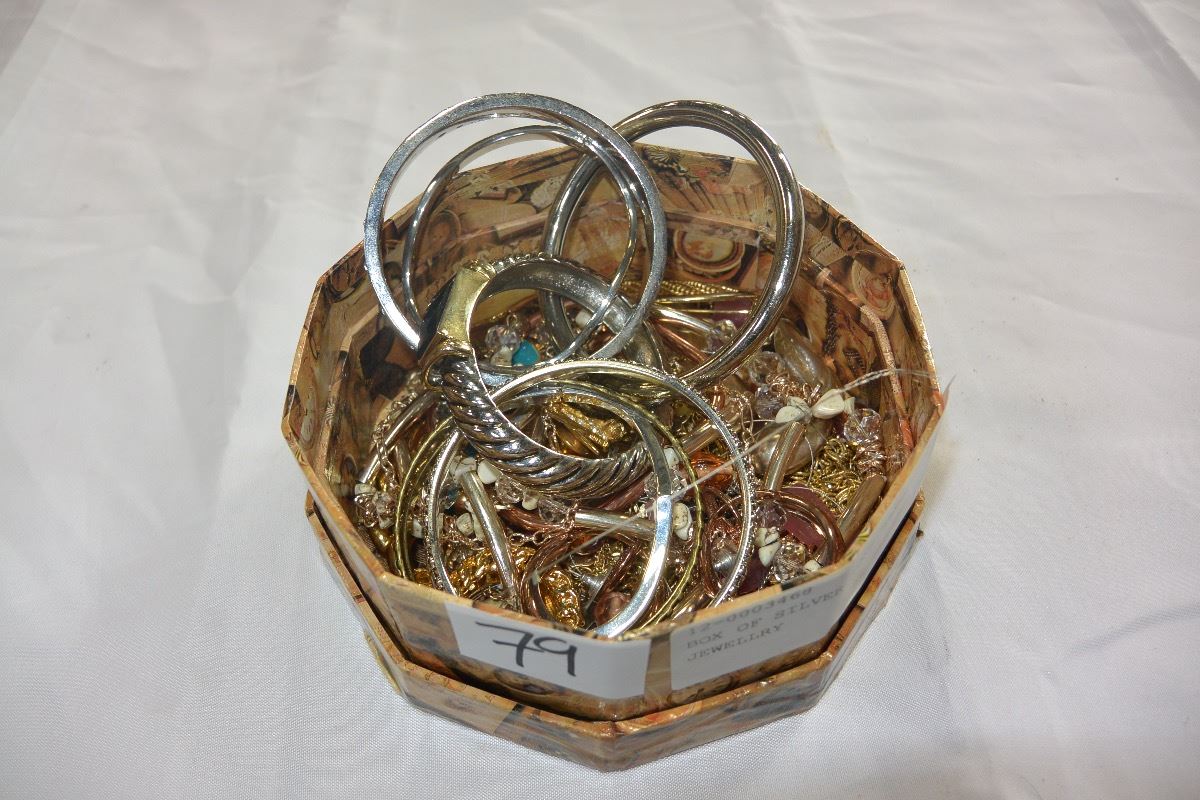 BOX OF SILVER TONE BANGLES AND JEWELLRY