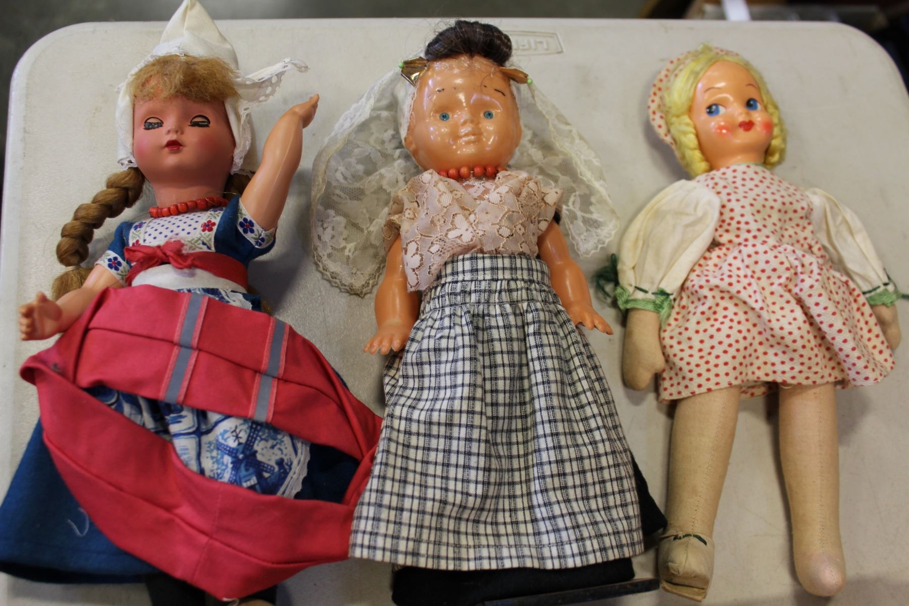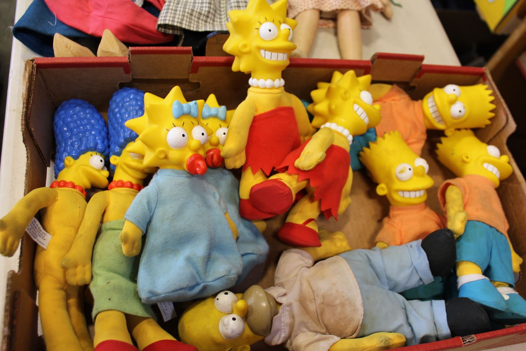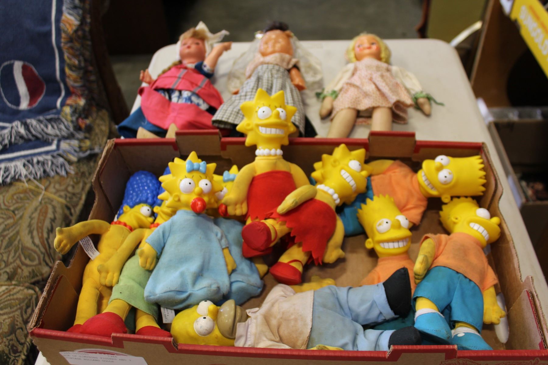 BOX OF SIMPSONS FIGURES AND 3 VINTAGE HOLLAND DOLLS