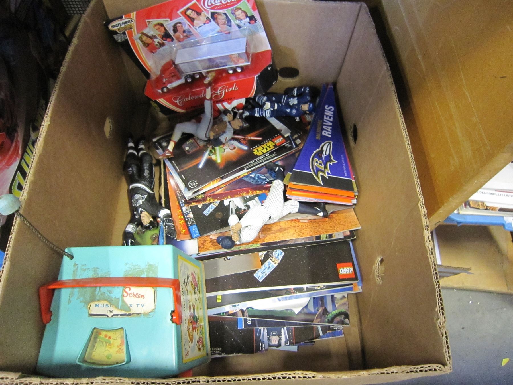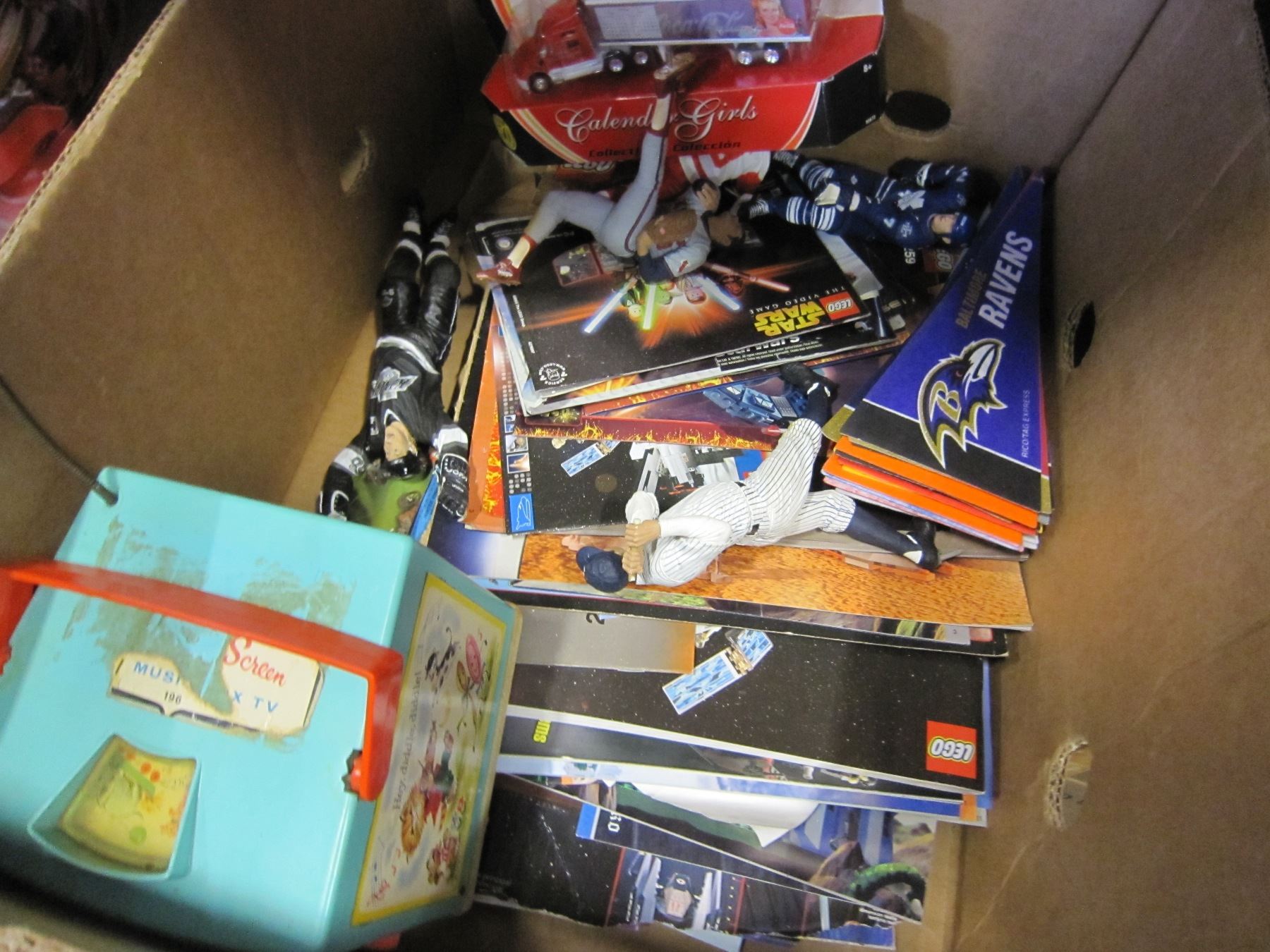 BOX OF SMALL BANNERS, LEGO. BOOKLETS, AND FIGURES