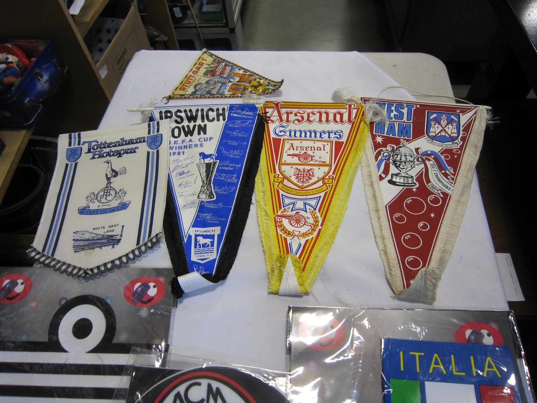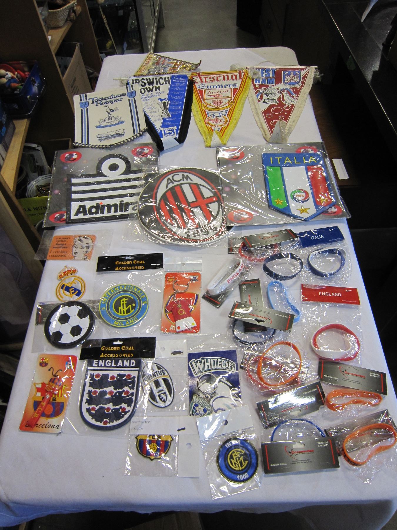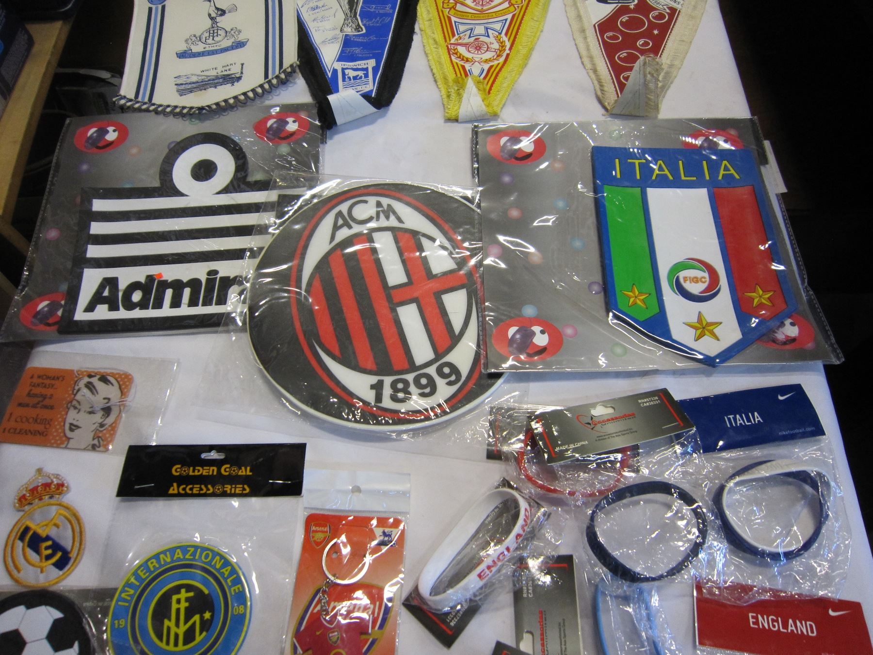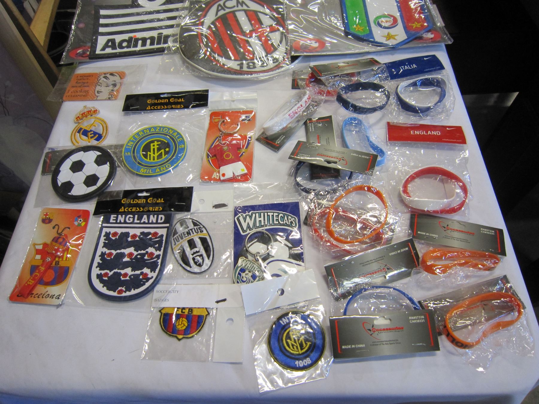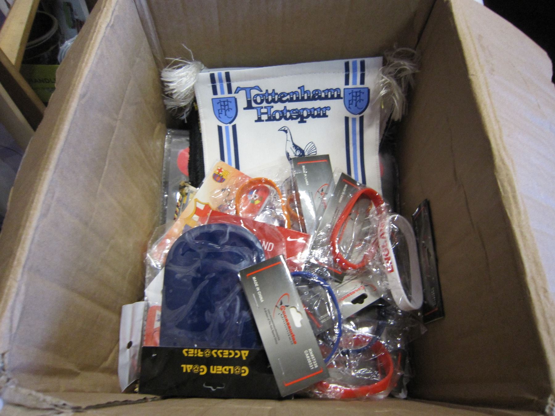 BOX OF SOCCER BADGES, PENENTS, MOUSE PADS AND WRIST BANDS
