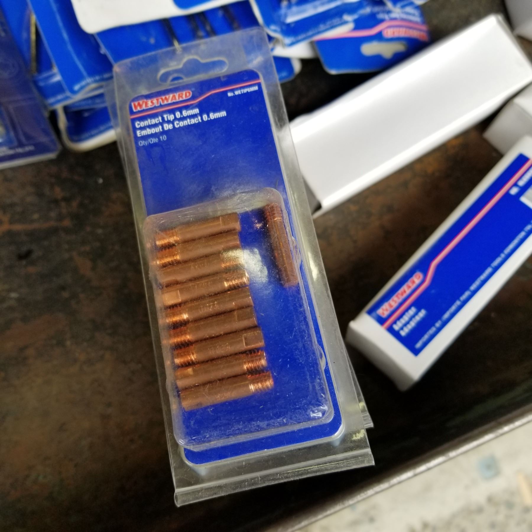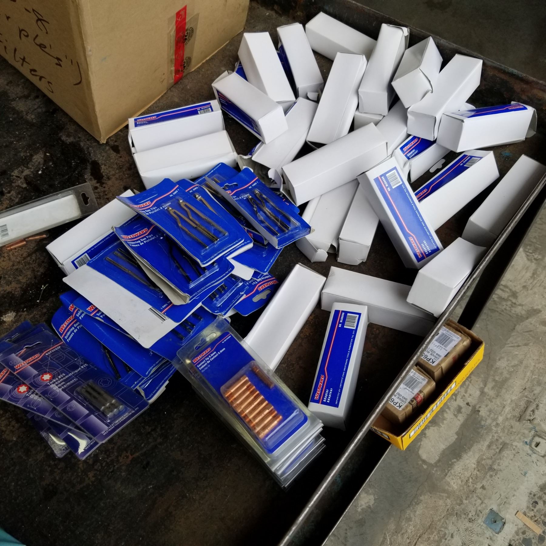 BOX OF SOLDERING GUN TIPS, MIG WELDING CONTACT TIPS, AND HOLE SAW ADAPTERS