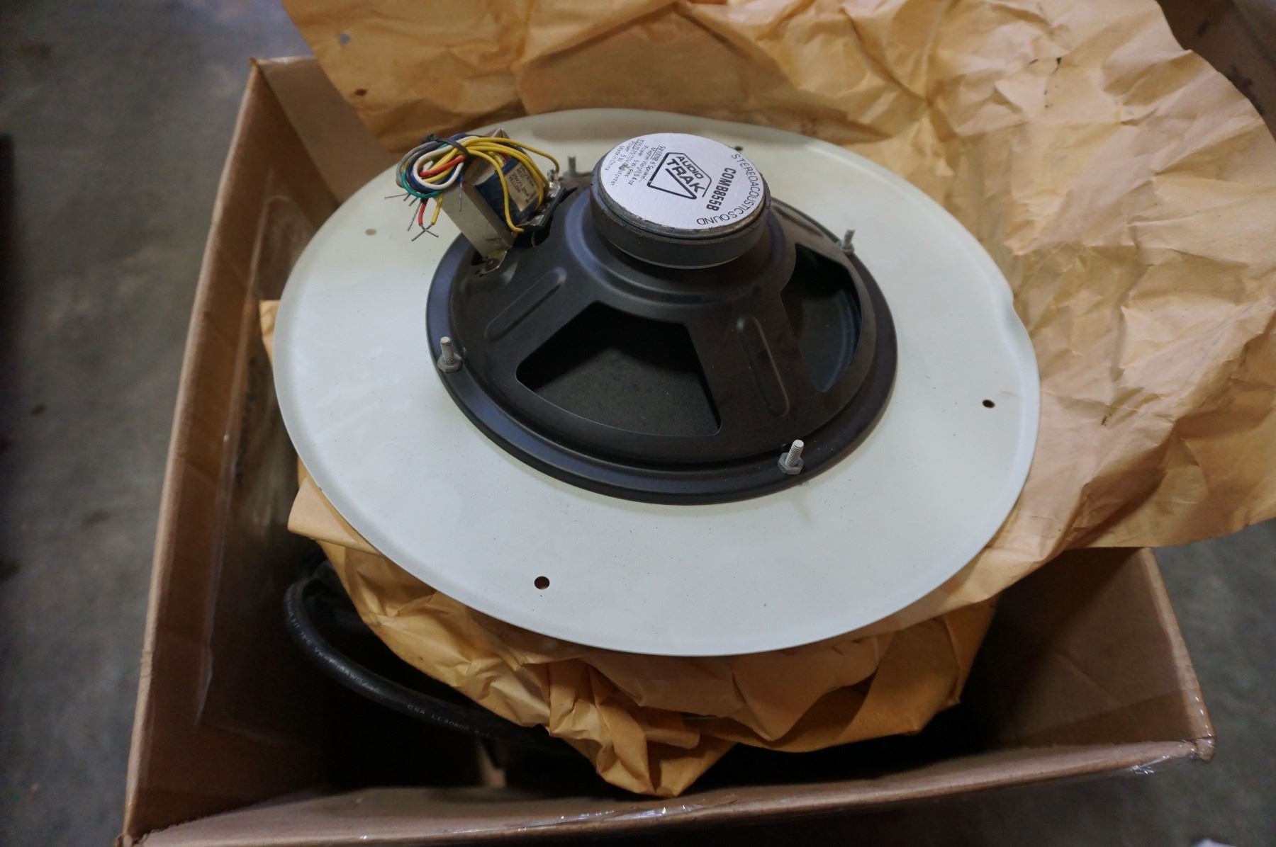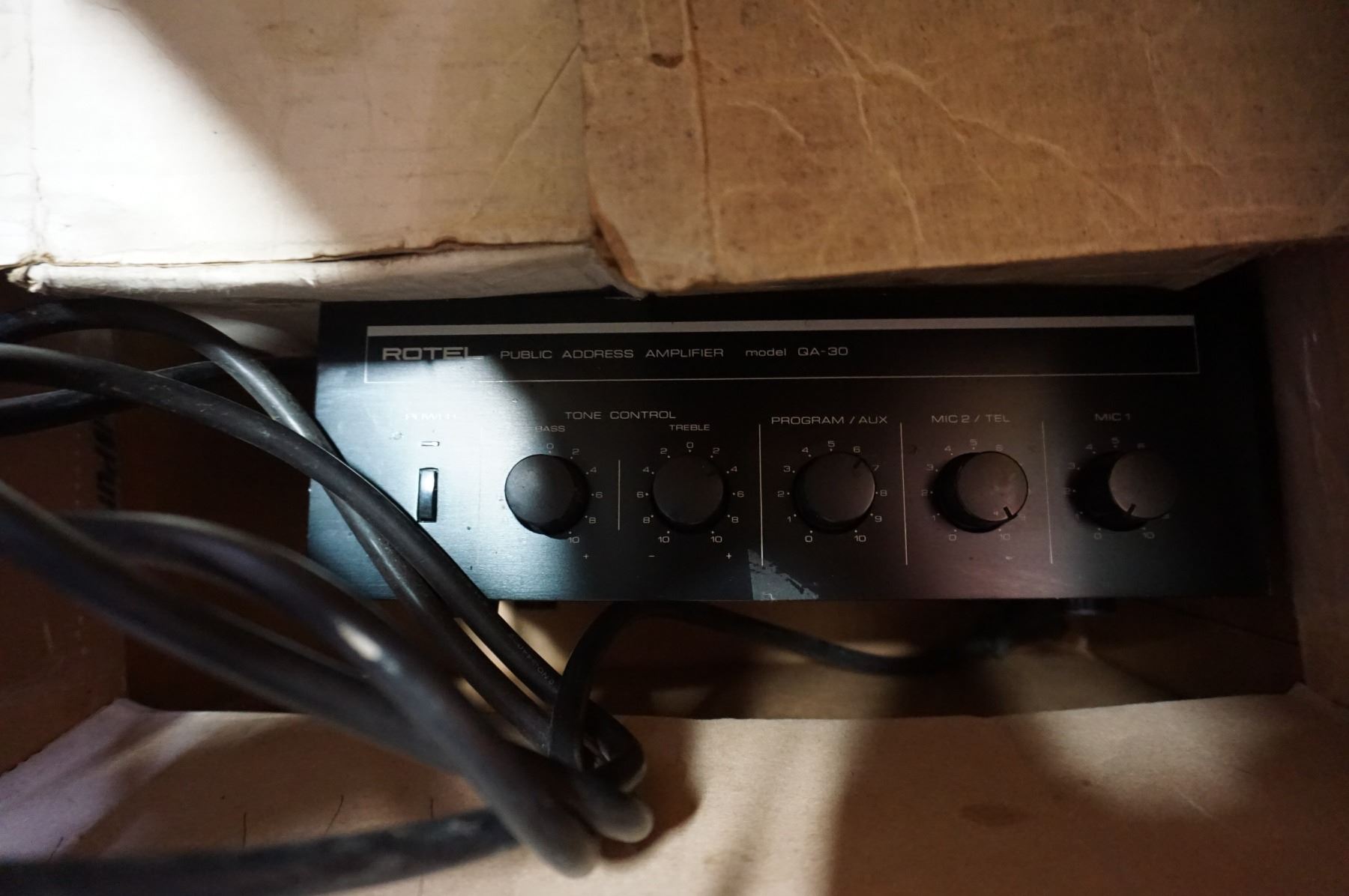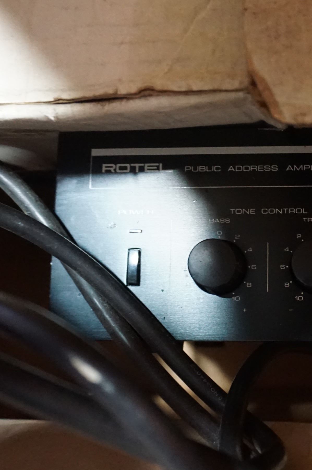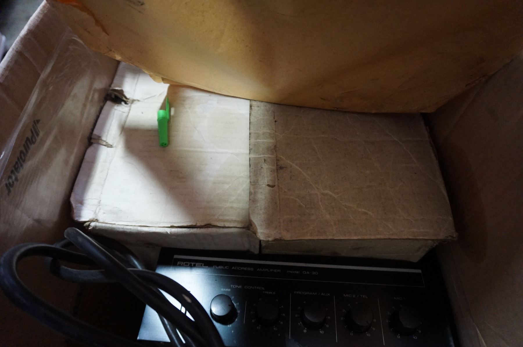 BOX OF SPEAKERS AND ROTEL PA AMP MODEL QA-30