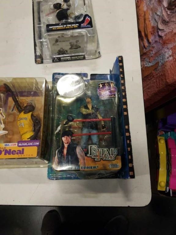 BOX OF SPORTS FIGURES - HOCKEY, BASKETBALL AND WWF UNDERTAKER FIGURE