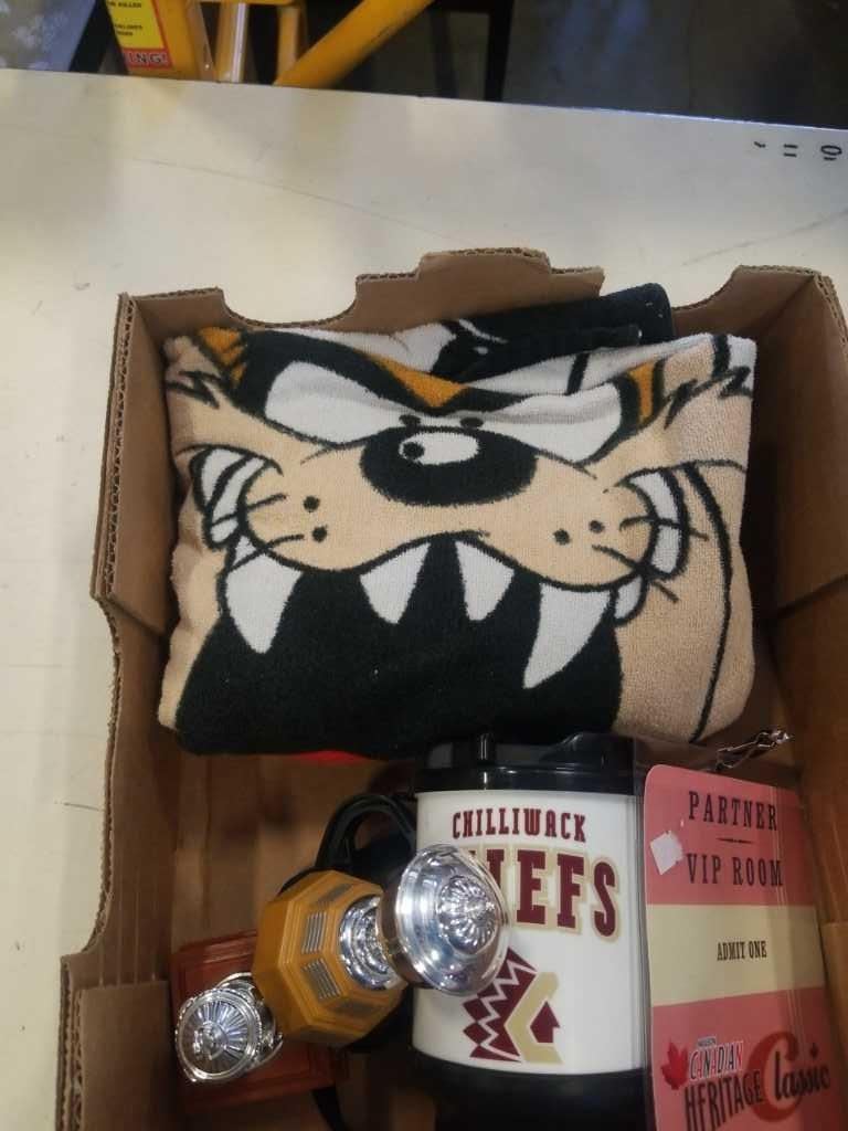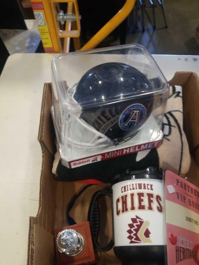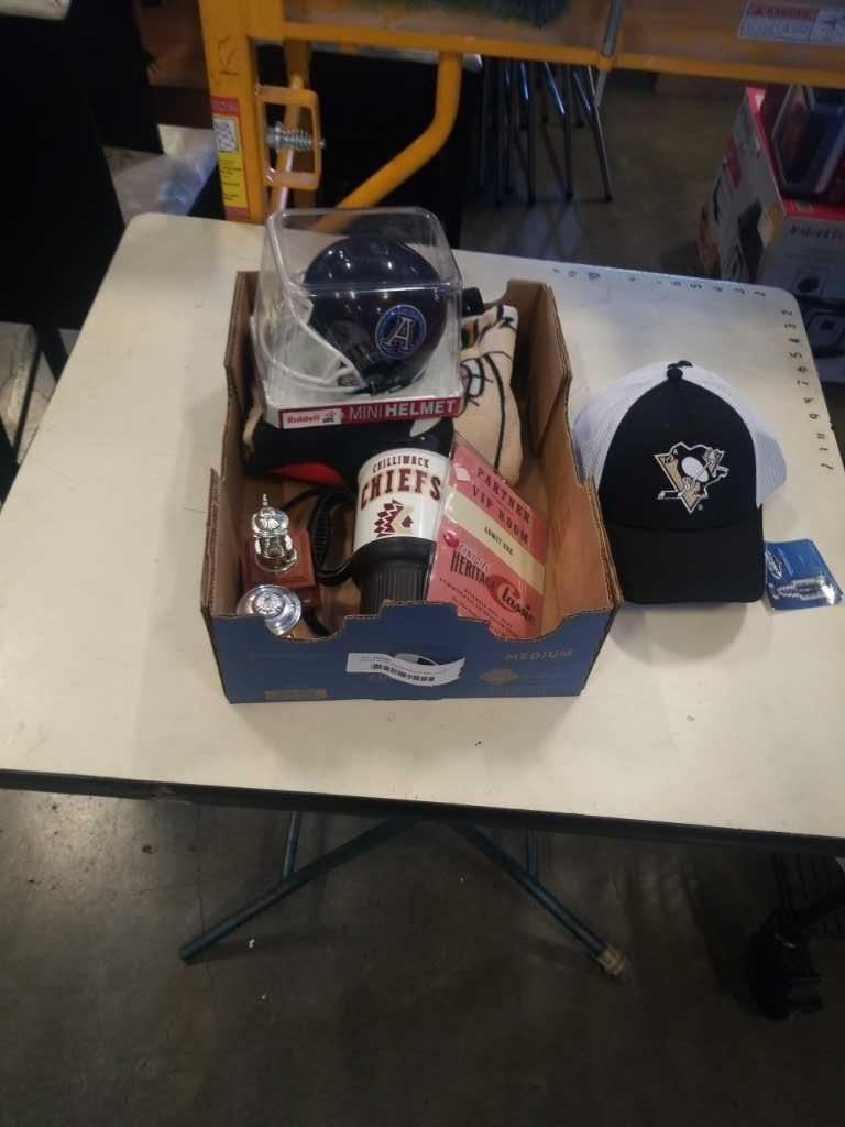 BOX OF SPORTS MEMORBILLA, BALL CAPS, ETC
