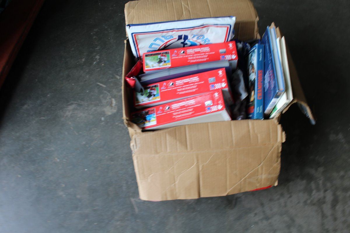 BOX OF SPORTS PUZZLES AND MEMORIBILIA