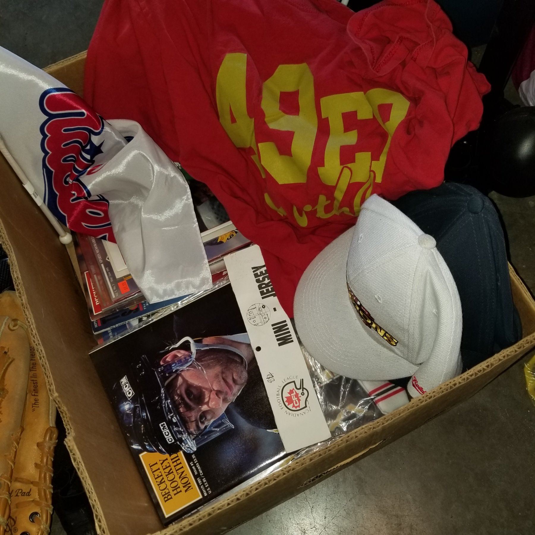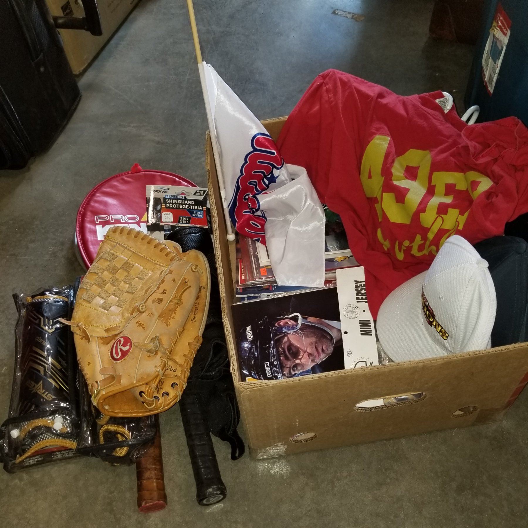 BOX OF SPORTS-RELATED ITEMS AND SPORTING GOODS