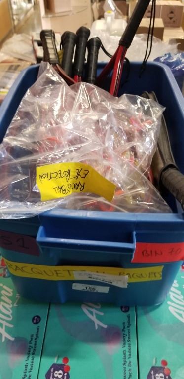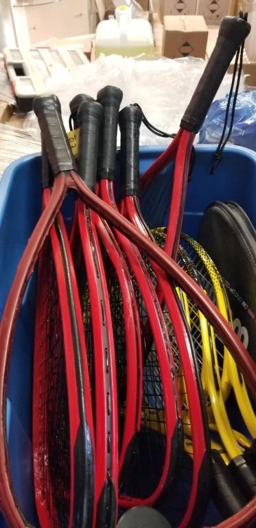 BOX OF SQUASH RACKETS AND SPORTING GOODS