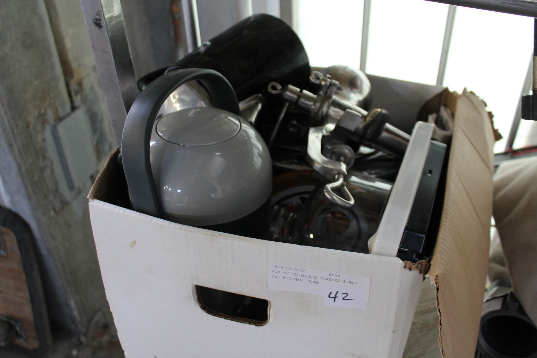 BOX OF STAINLESS TOASTER SCALE AND KITCHEN ITEMS