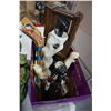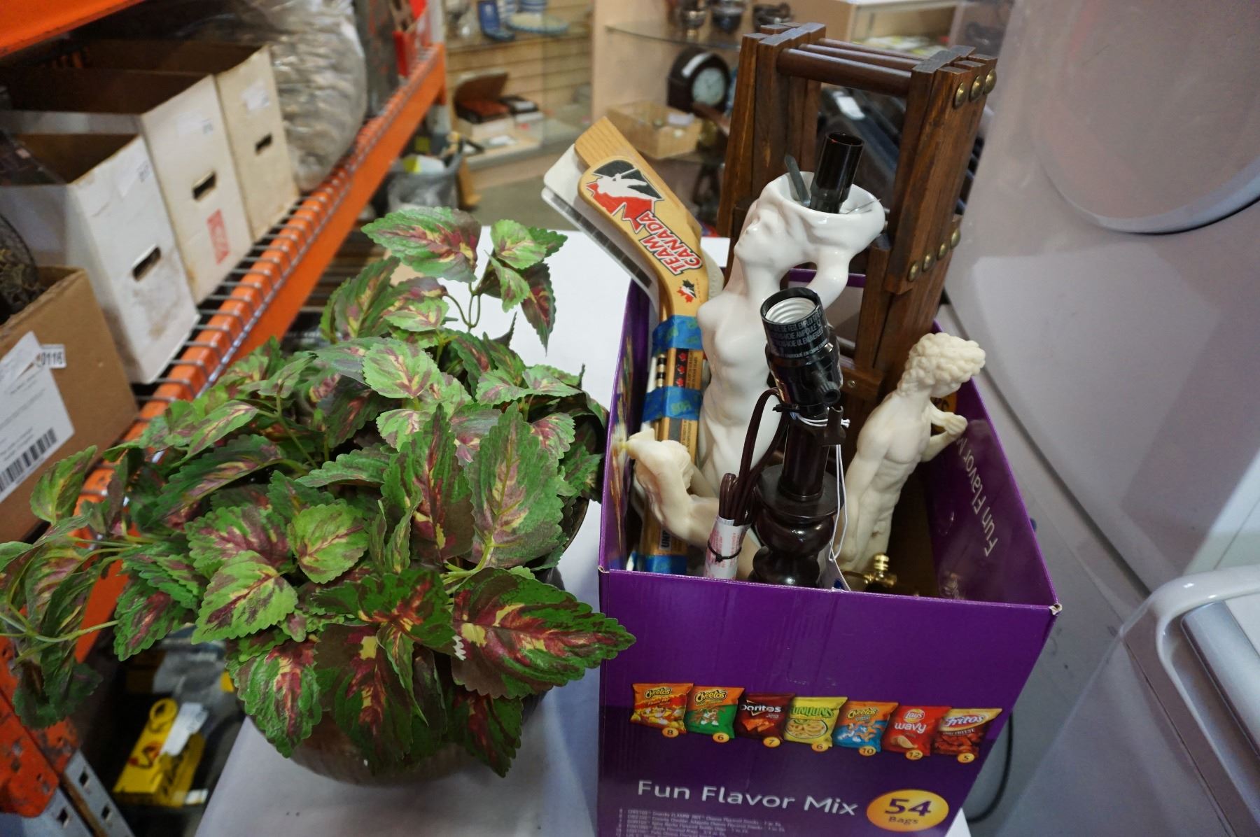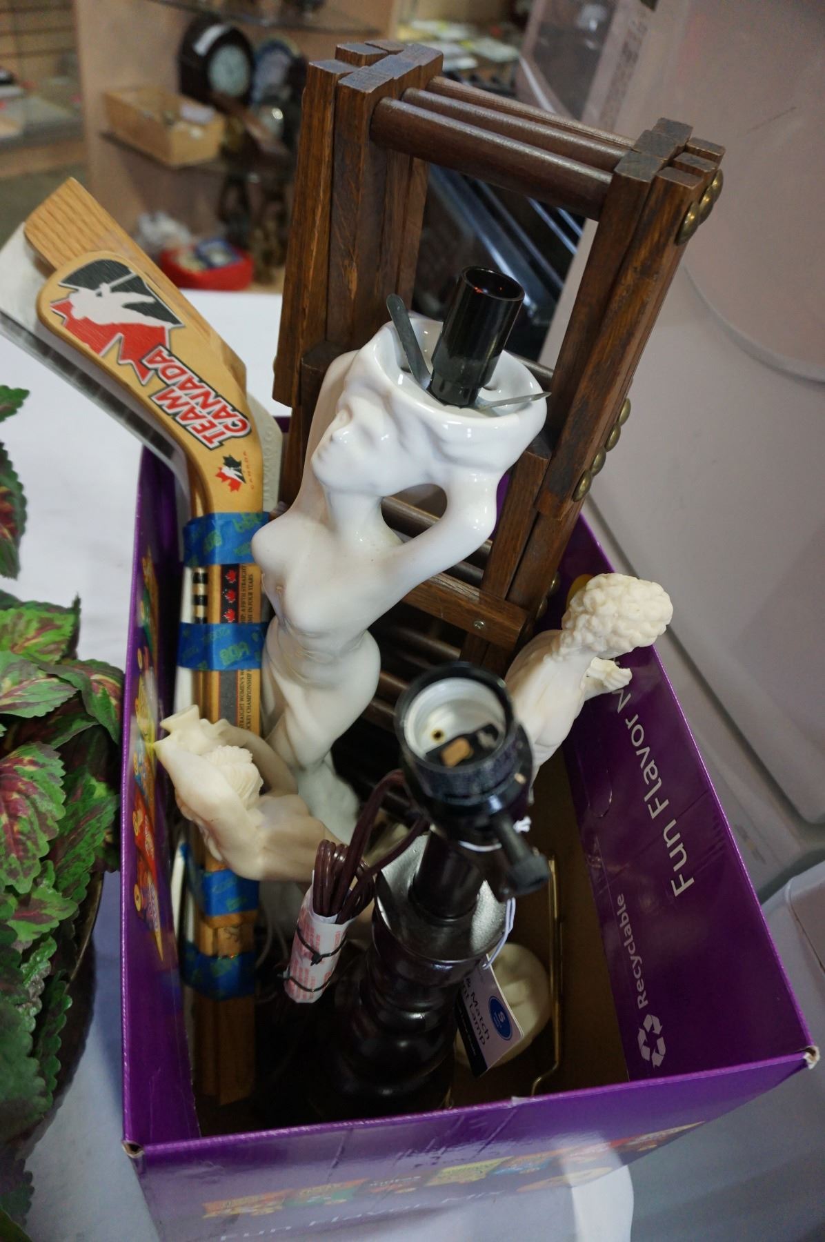 BOX OF STATUES, COLLECTIBLE HOCKEY STICKS, AND BRASS PLANTER