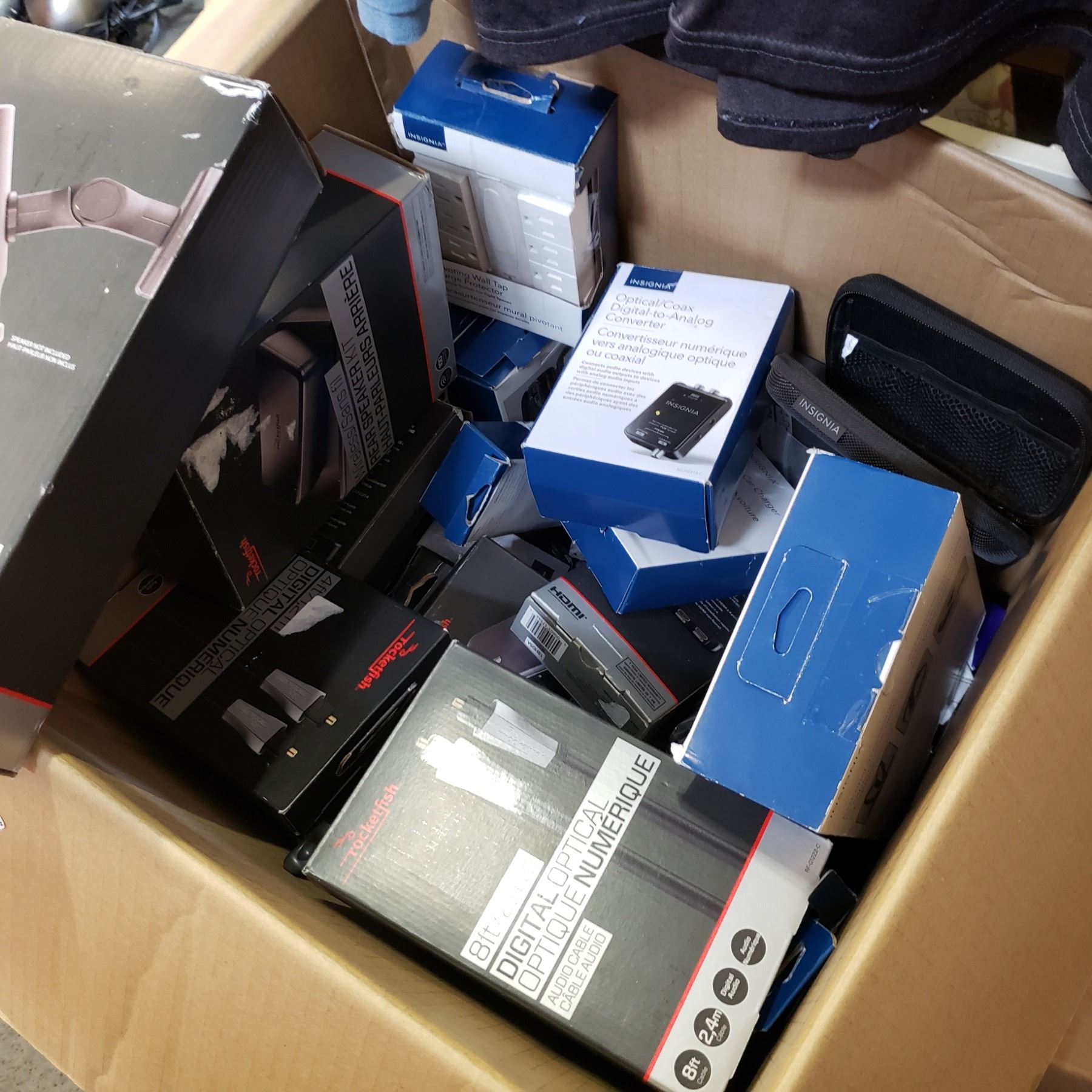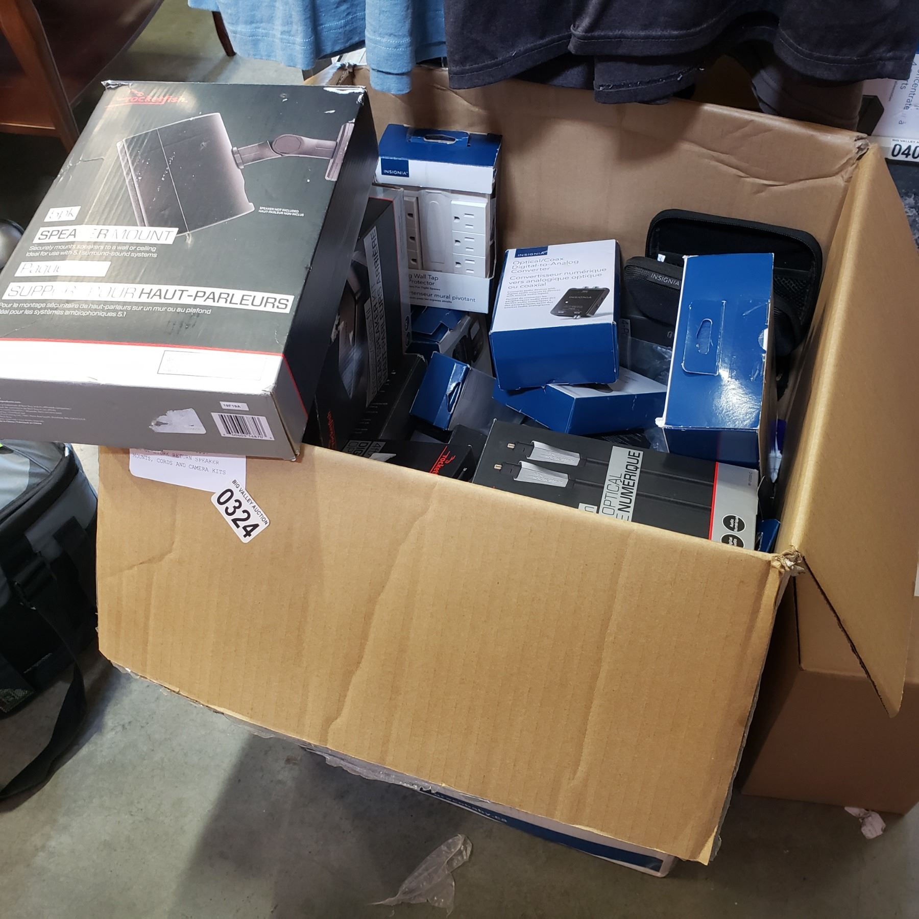 BOX OF STORE RETURN SPEAKER MOUNTS, CORDS AND CAMERA KITS