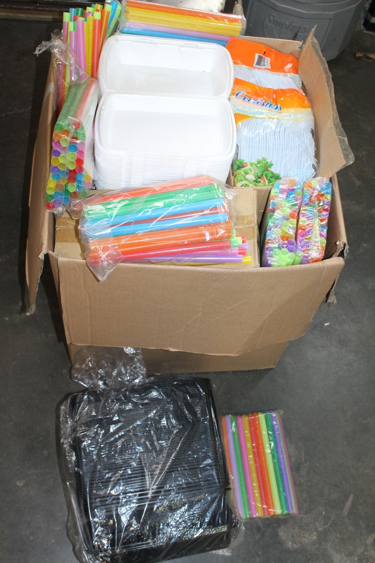 BOX OF STRAWS AND RESTAURANT CONTAINERS