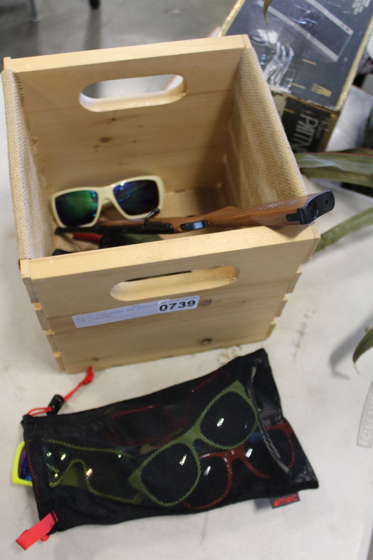 BOX OF SUNGLASSES AND NOVELTY GUN LIGHTERS