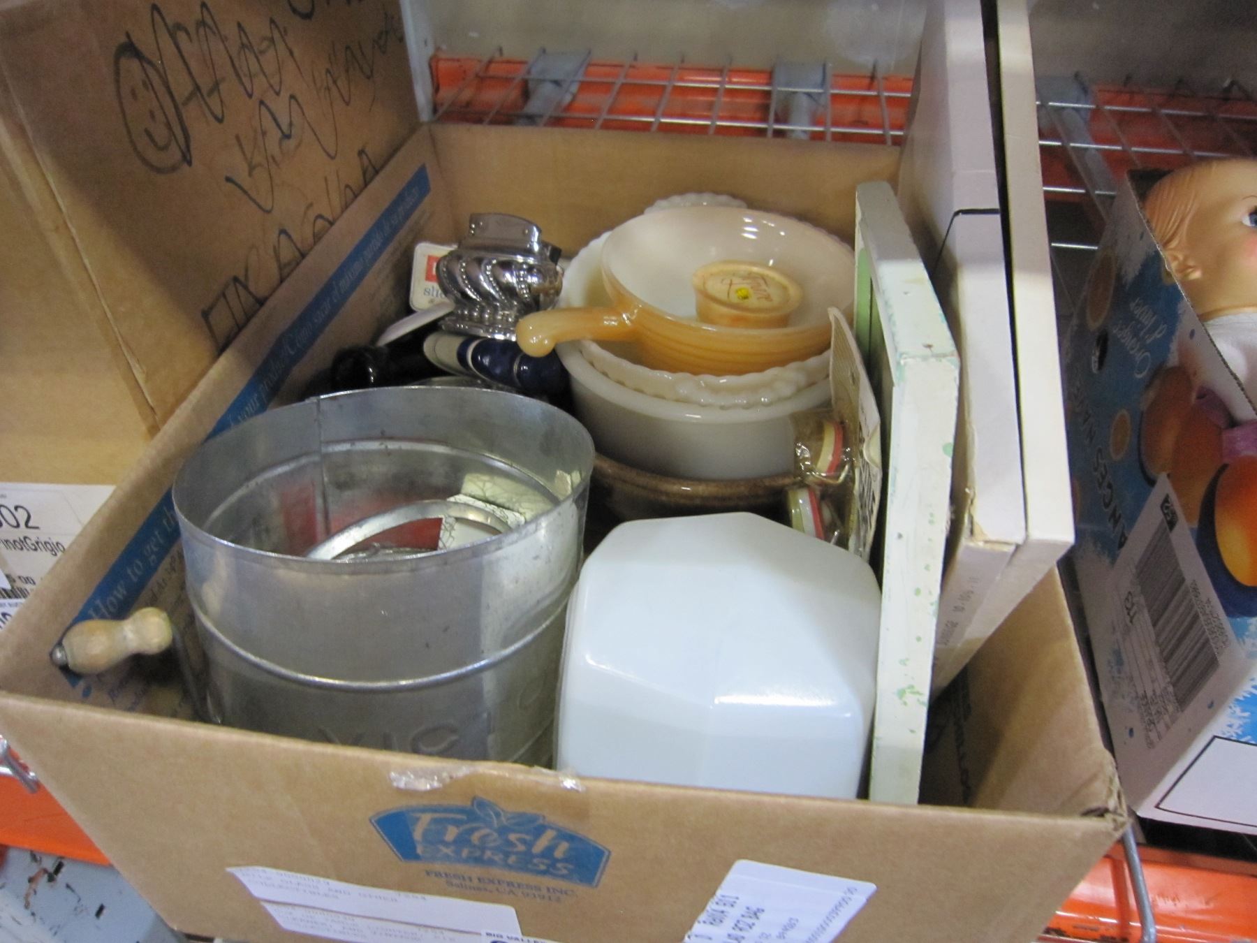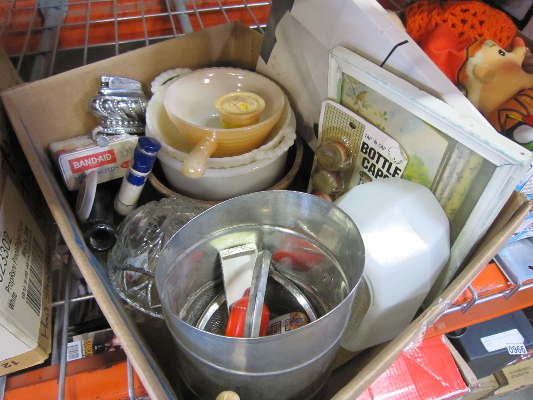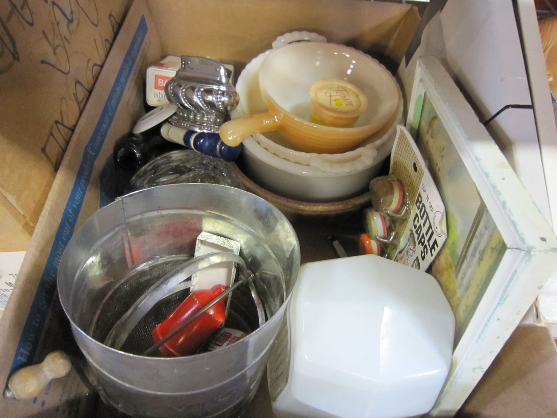 BOX OF TABLE LIGHTER, PIP CLEANER, AND VINTAGE COLLECTIBLES AND MILK GLASS AND OTHER COLLECTIBLES