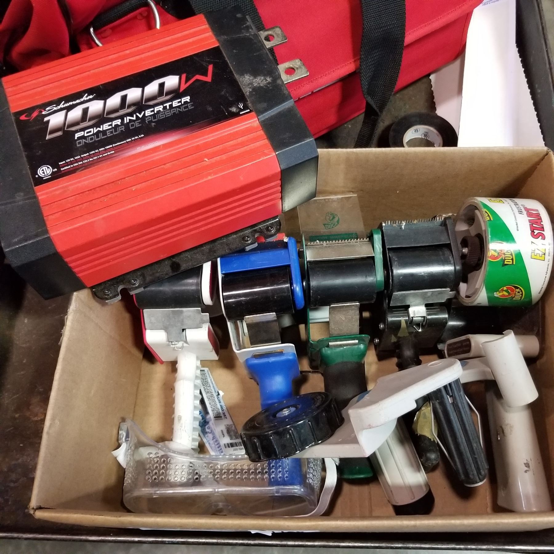 BOX OF TAPE DISPENSERS AND 1000 WATT POWER INVERTER