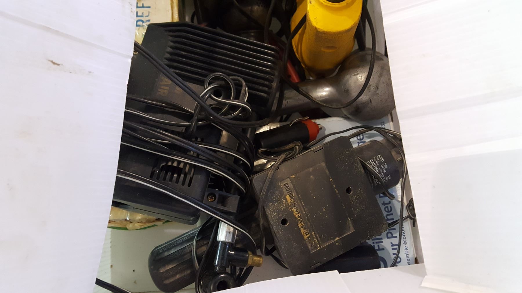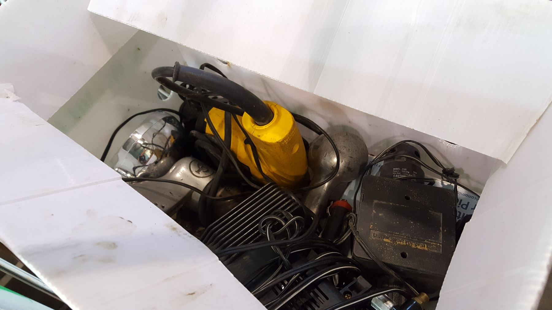 BOX OF TOOLS AND A SMALL AIR COMPRESSOR