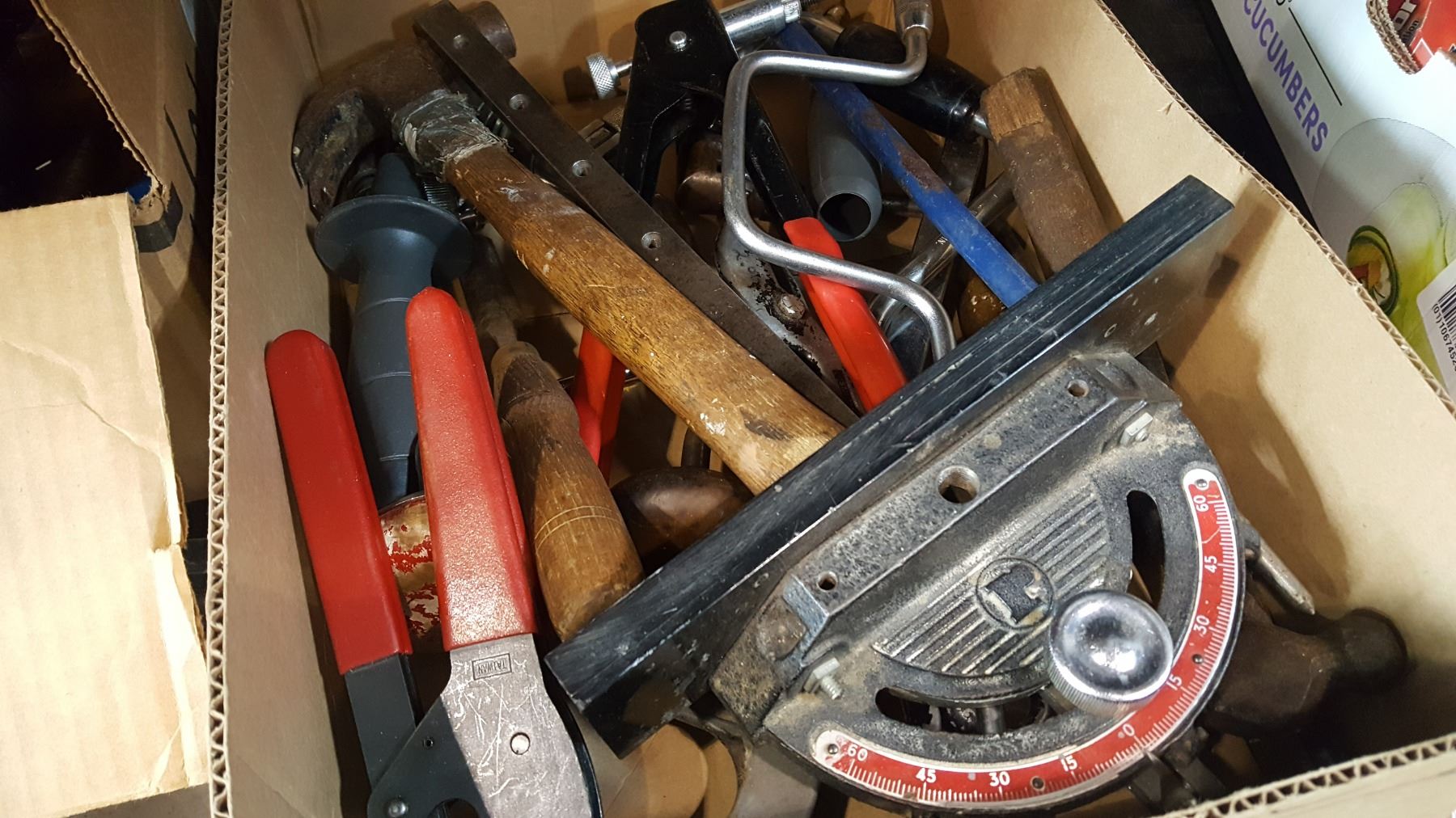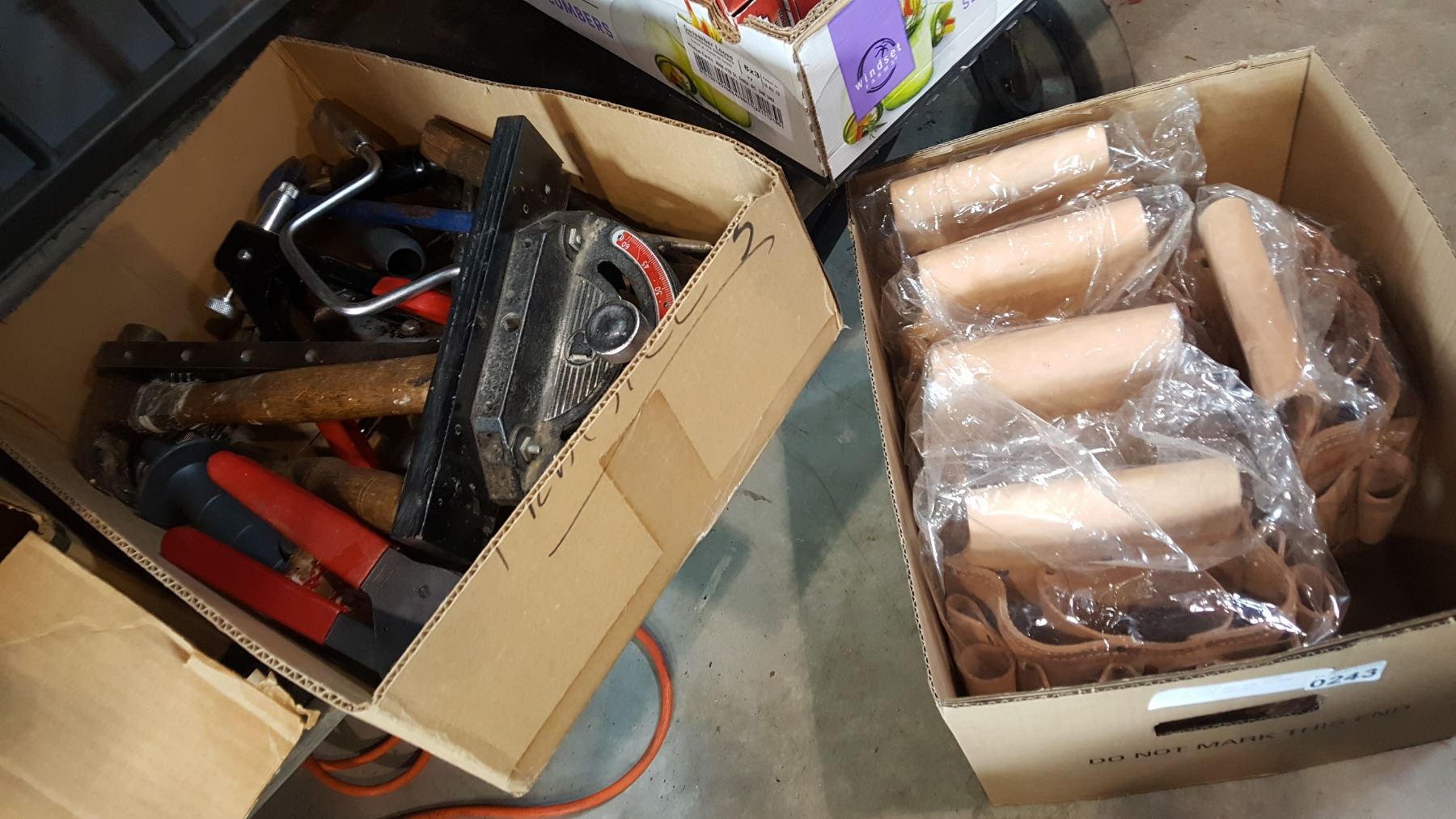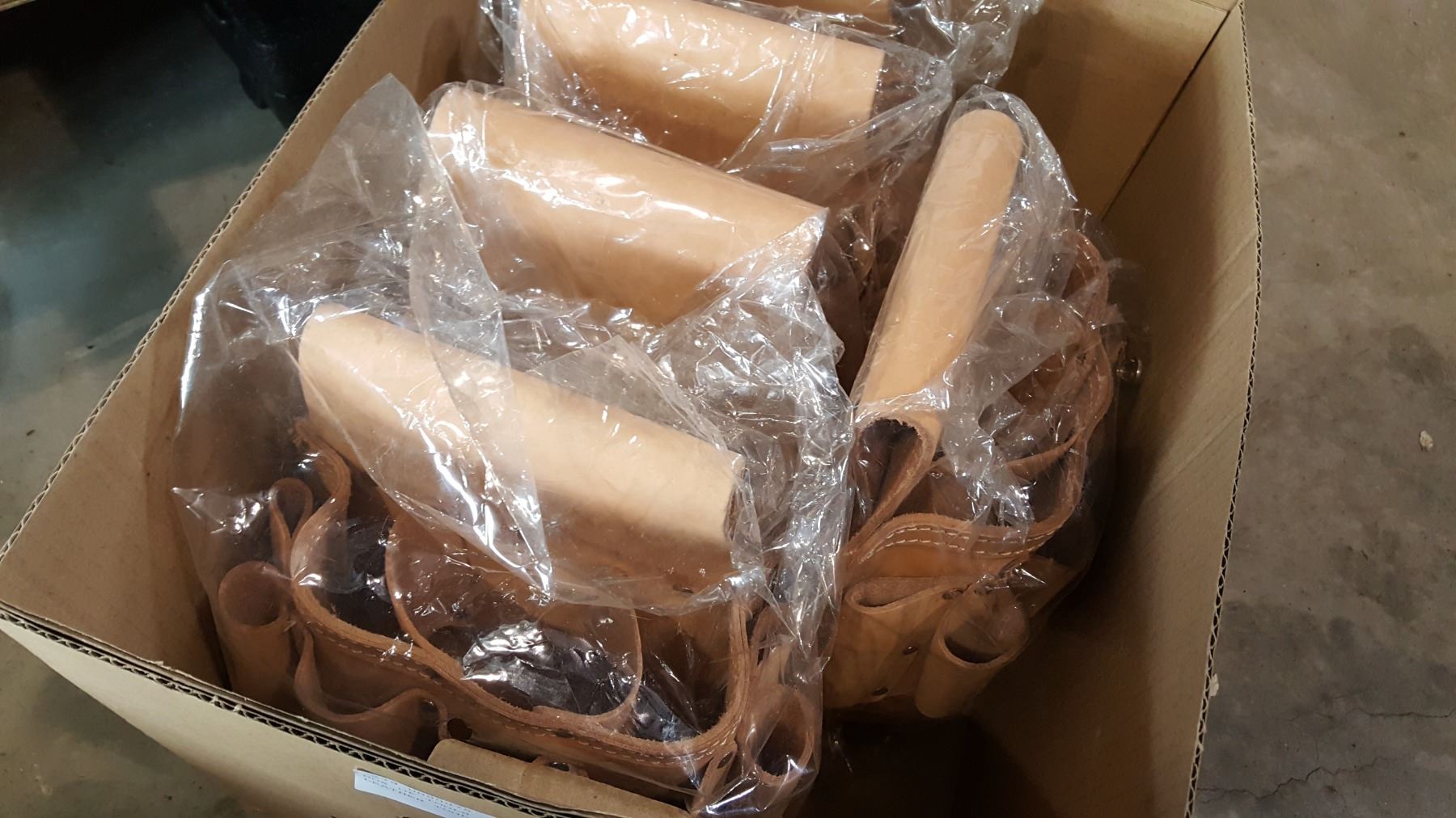 BOX OF TOOLS AND BOX OF NEW LEATHER TOOL POUCHES