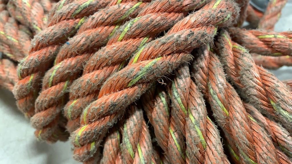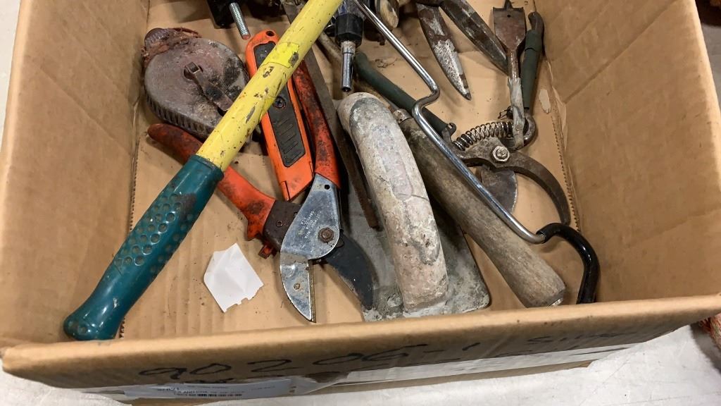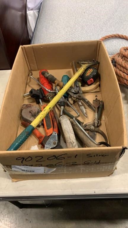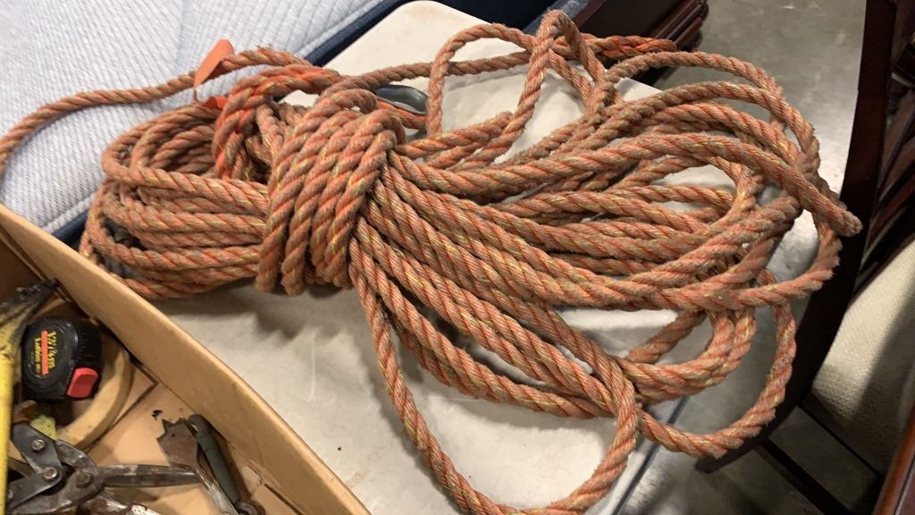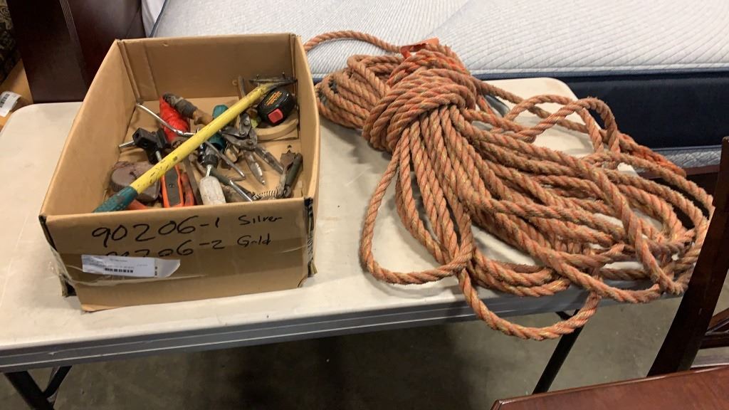 BOX OF TOOLS AND COIL OF 3/4" ROPE