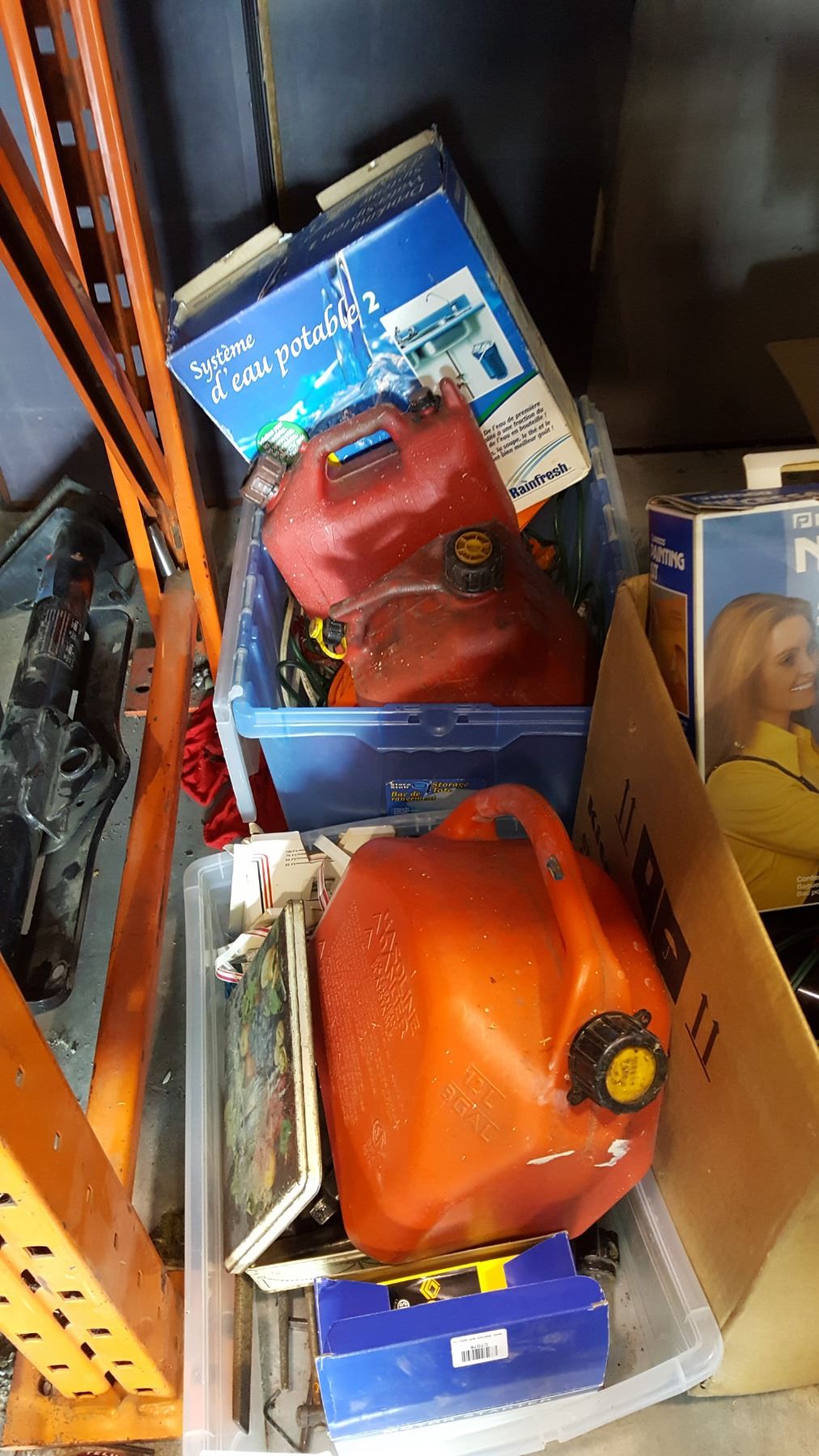 BOX OF TOOLS AND EXTENTION CORDS AND JERRY CANS