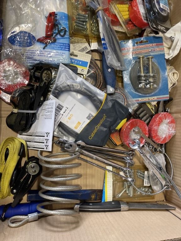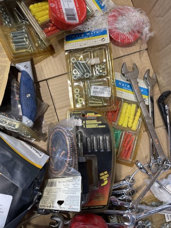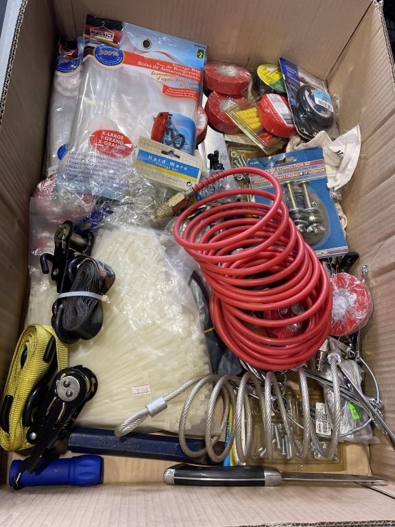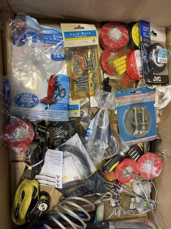 BOX OF TOOLS, ELECTRICAL TAPE, VACUUM STORAGE BAGS AND MORE