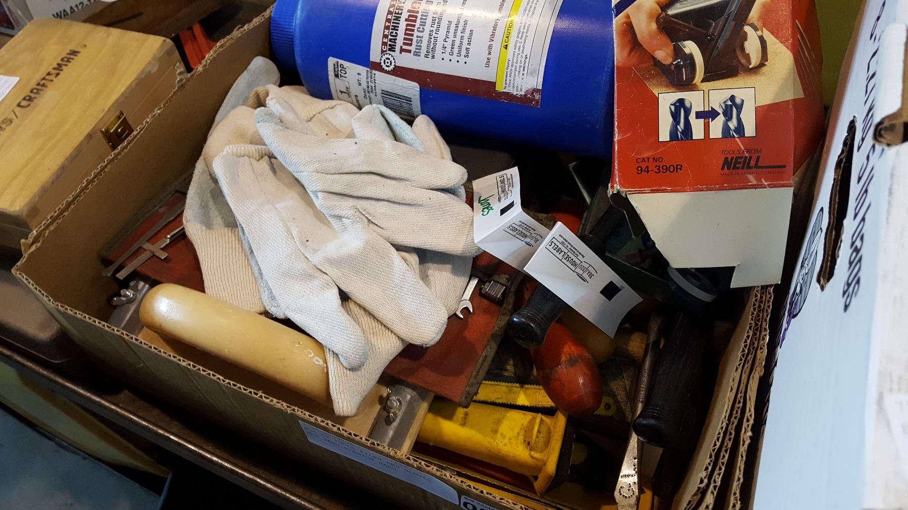 BOX OF TOOLS FILES AND GLOVES AND SAND BLASTOR SAND