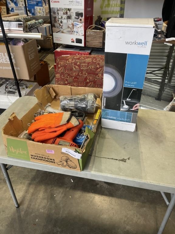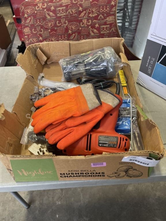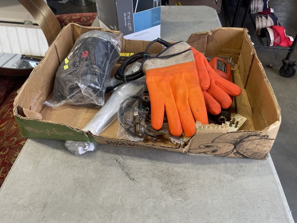 BOX OF TOOLS, LIGHTS, WORK GLOVES, ETC