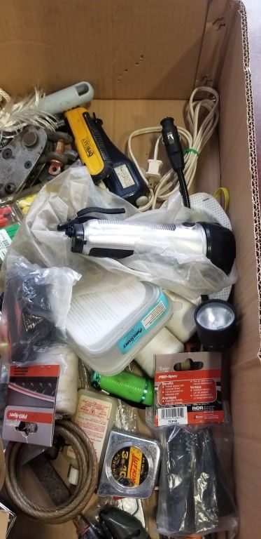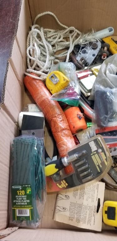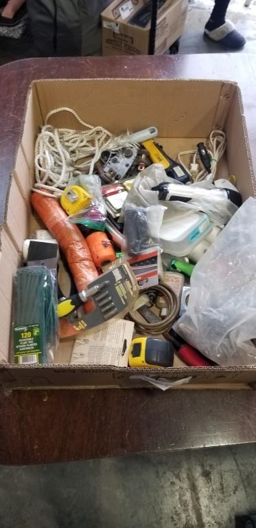 BOX OF TOOLS,, MEASURING TIPS, SHOP SUPPLIES AND MORE