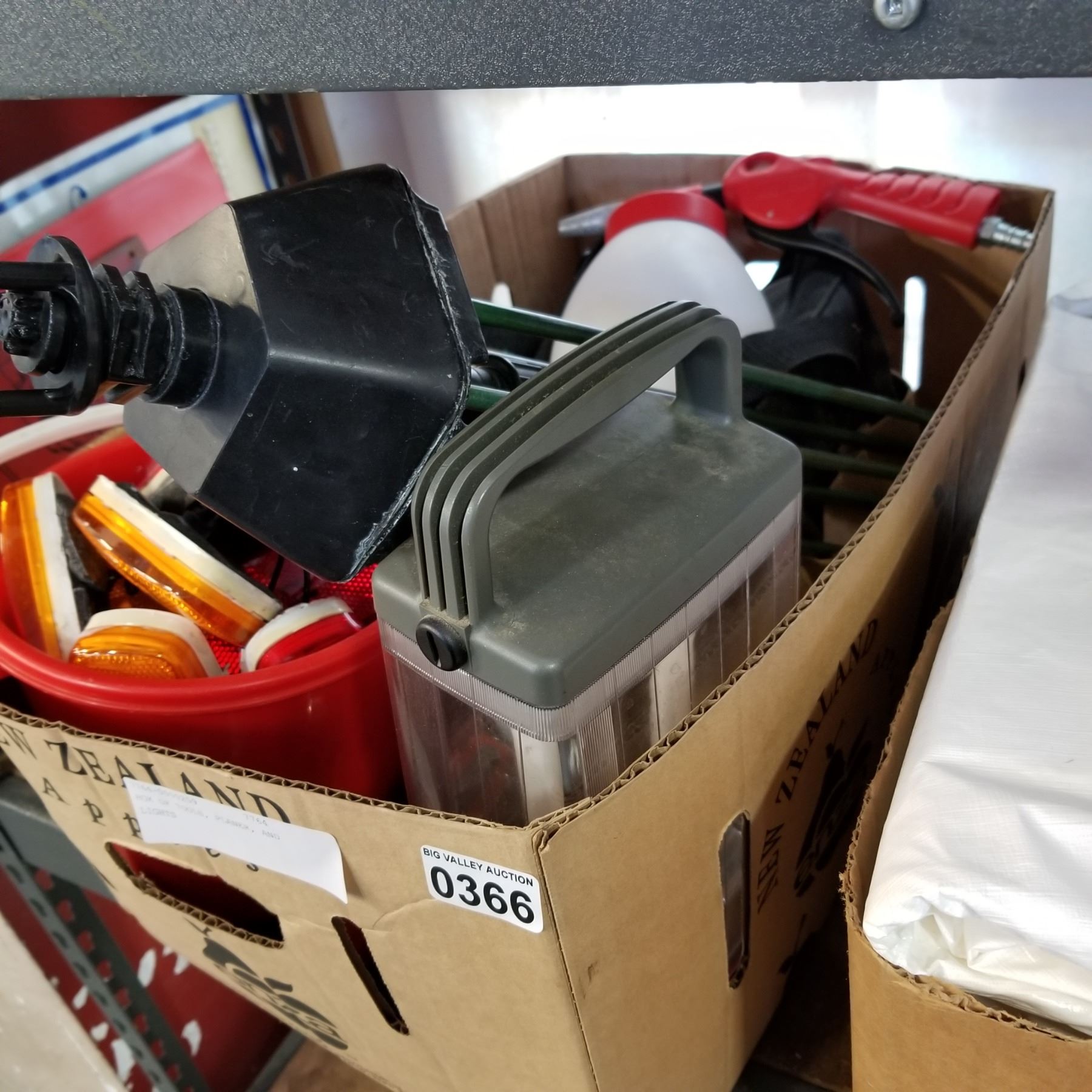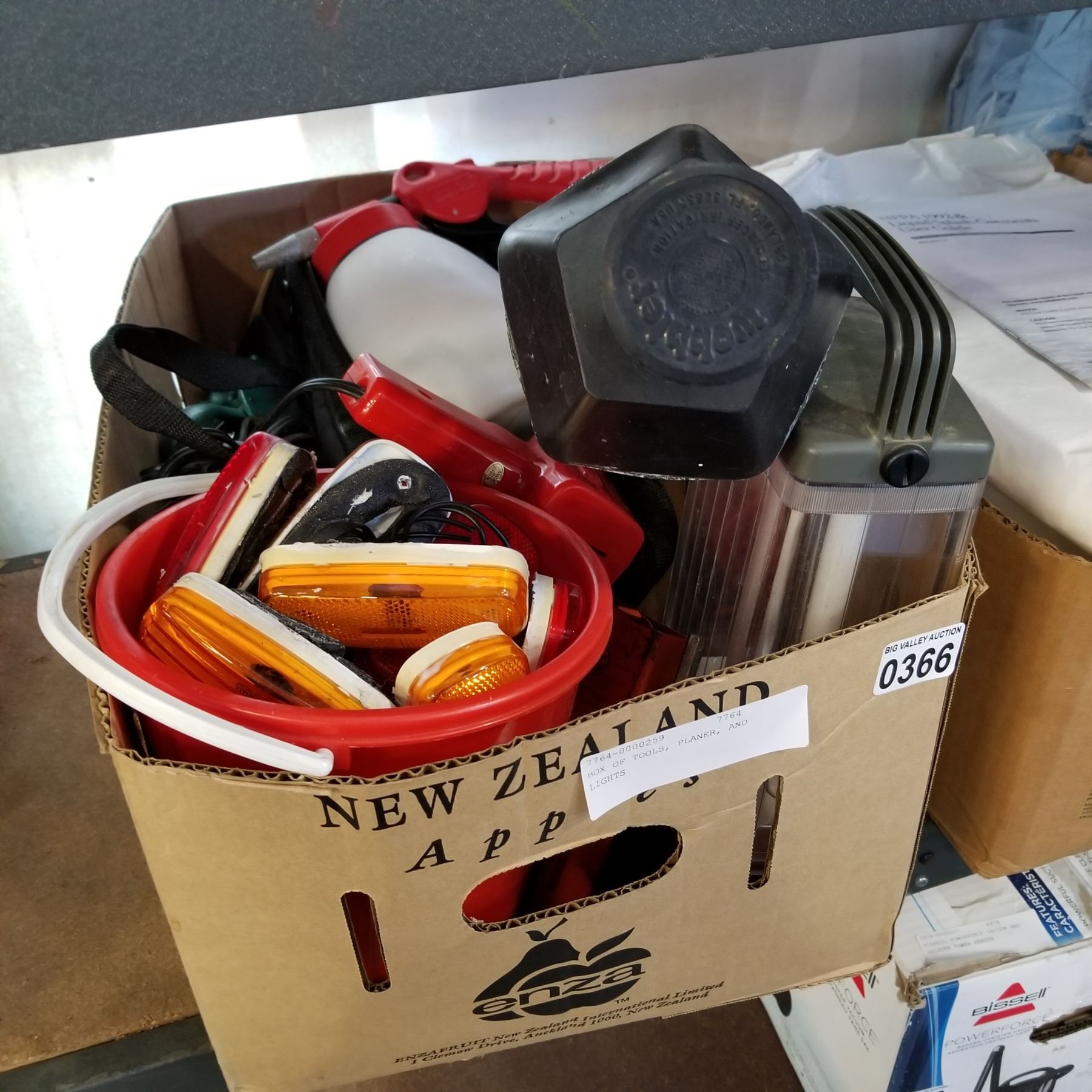 BOX OF TOOLS, PLANER, AND LIGHTS