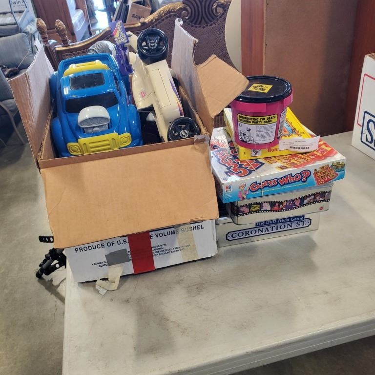 BOX OF TOY VEHICLES AND 5 BOARD GAMES