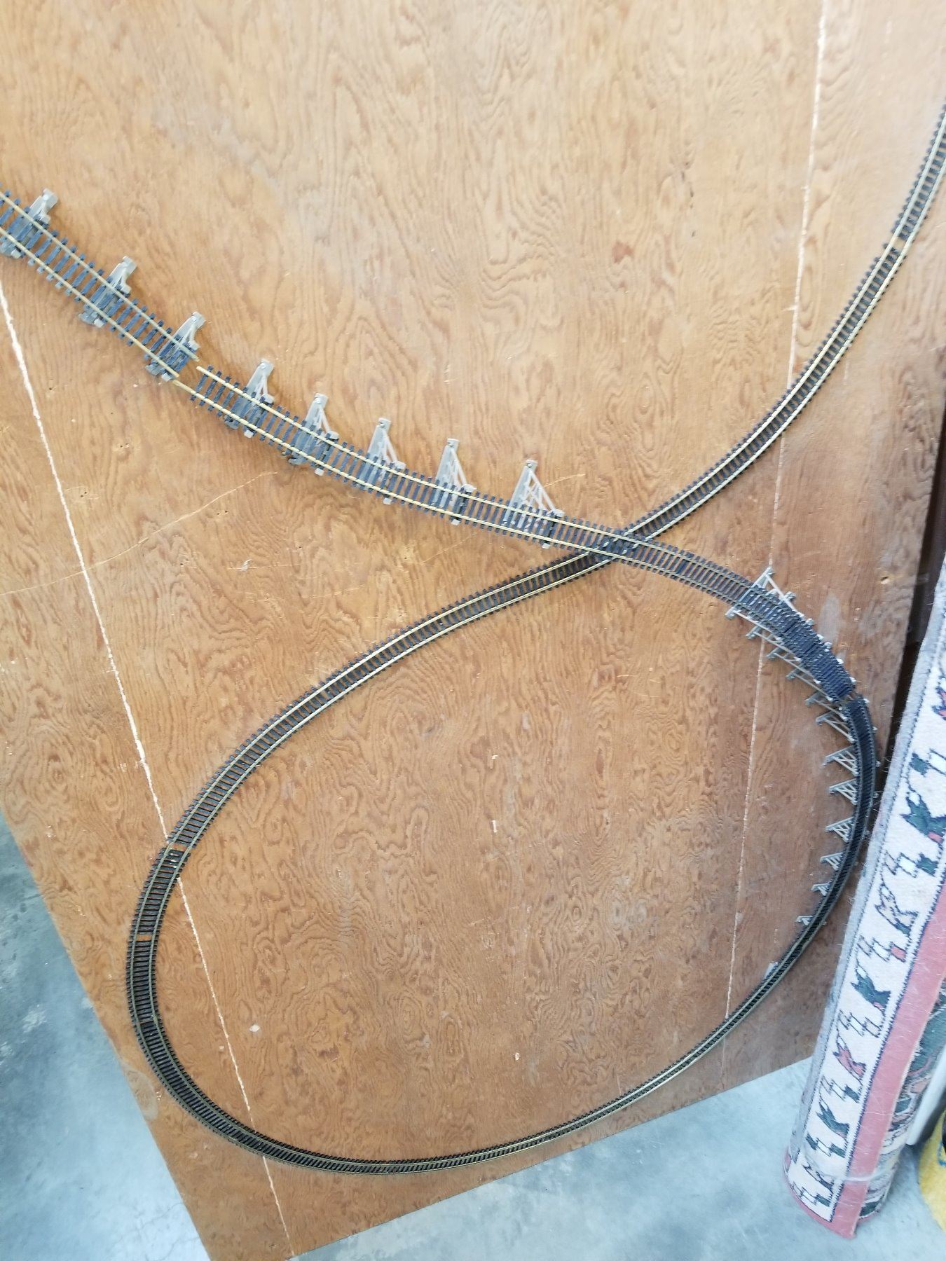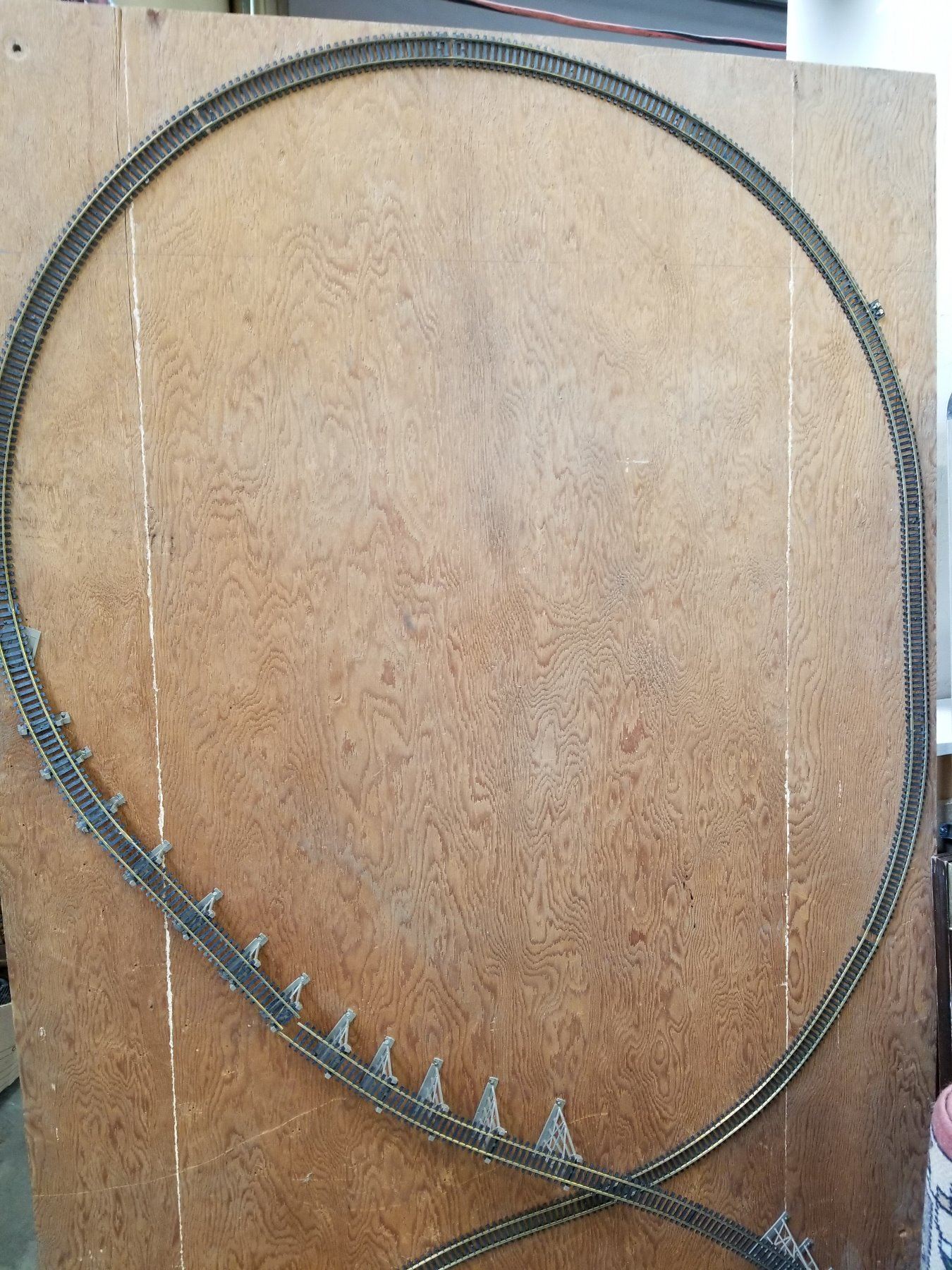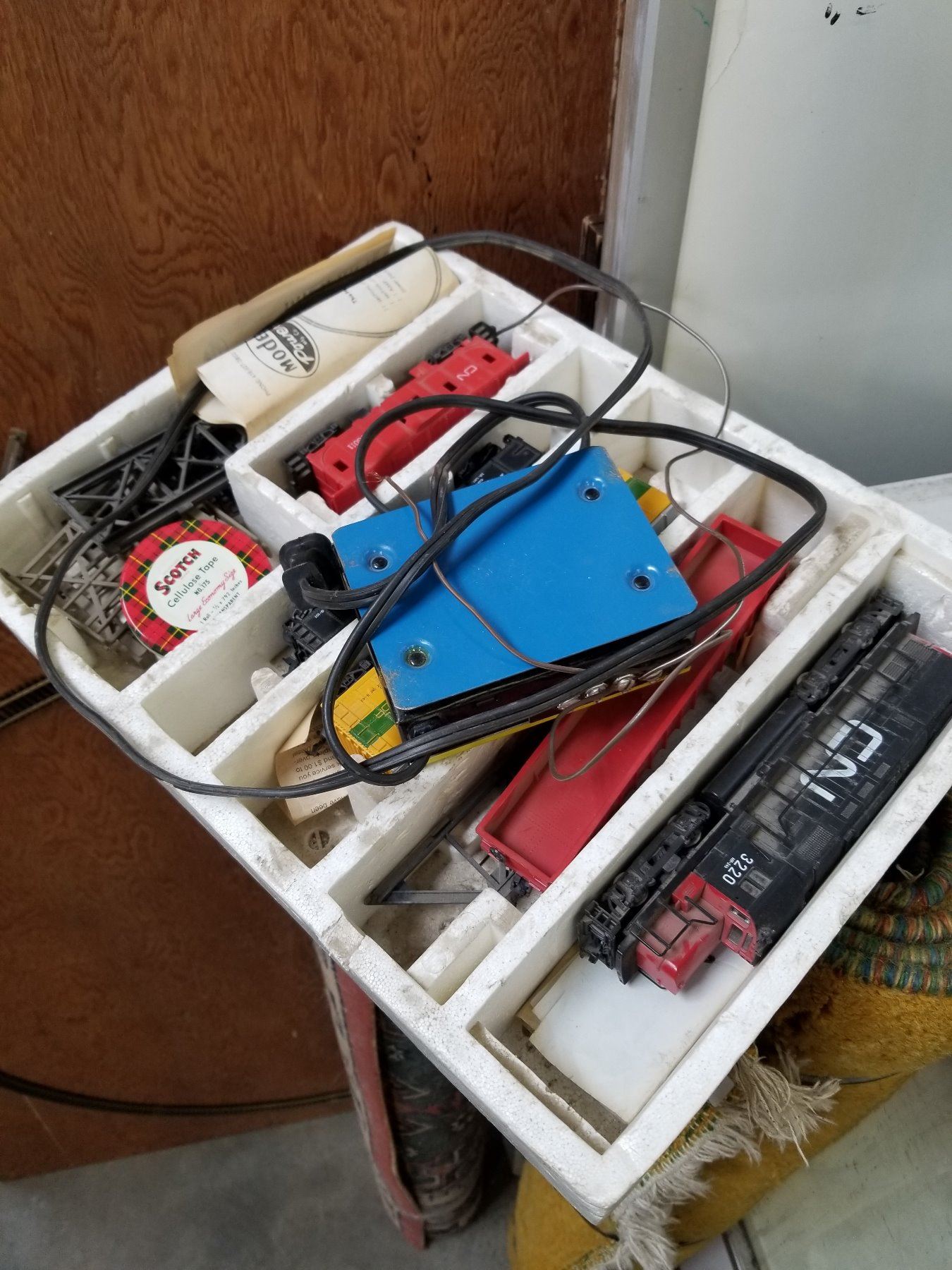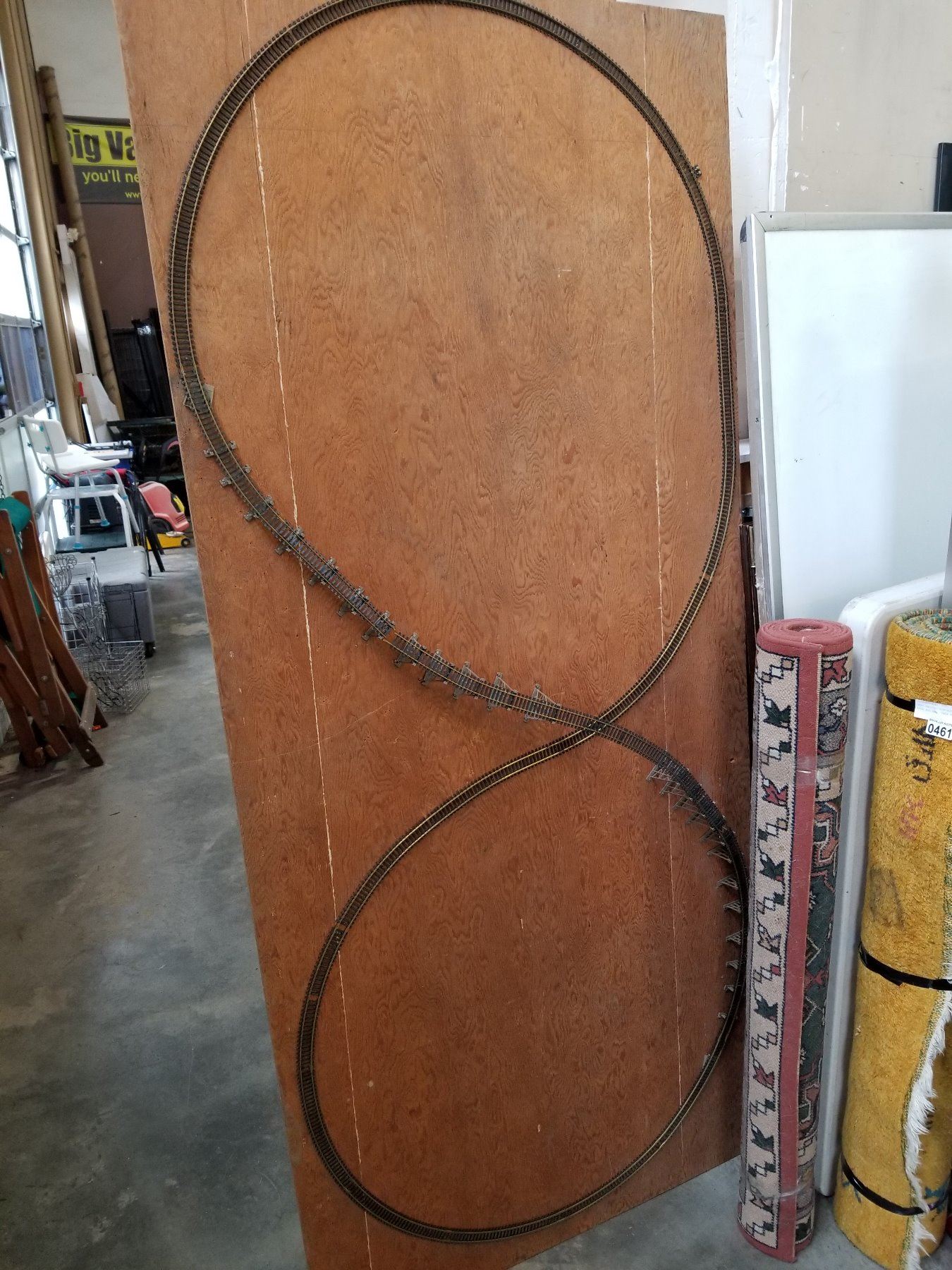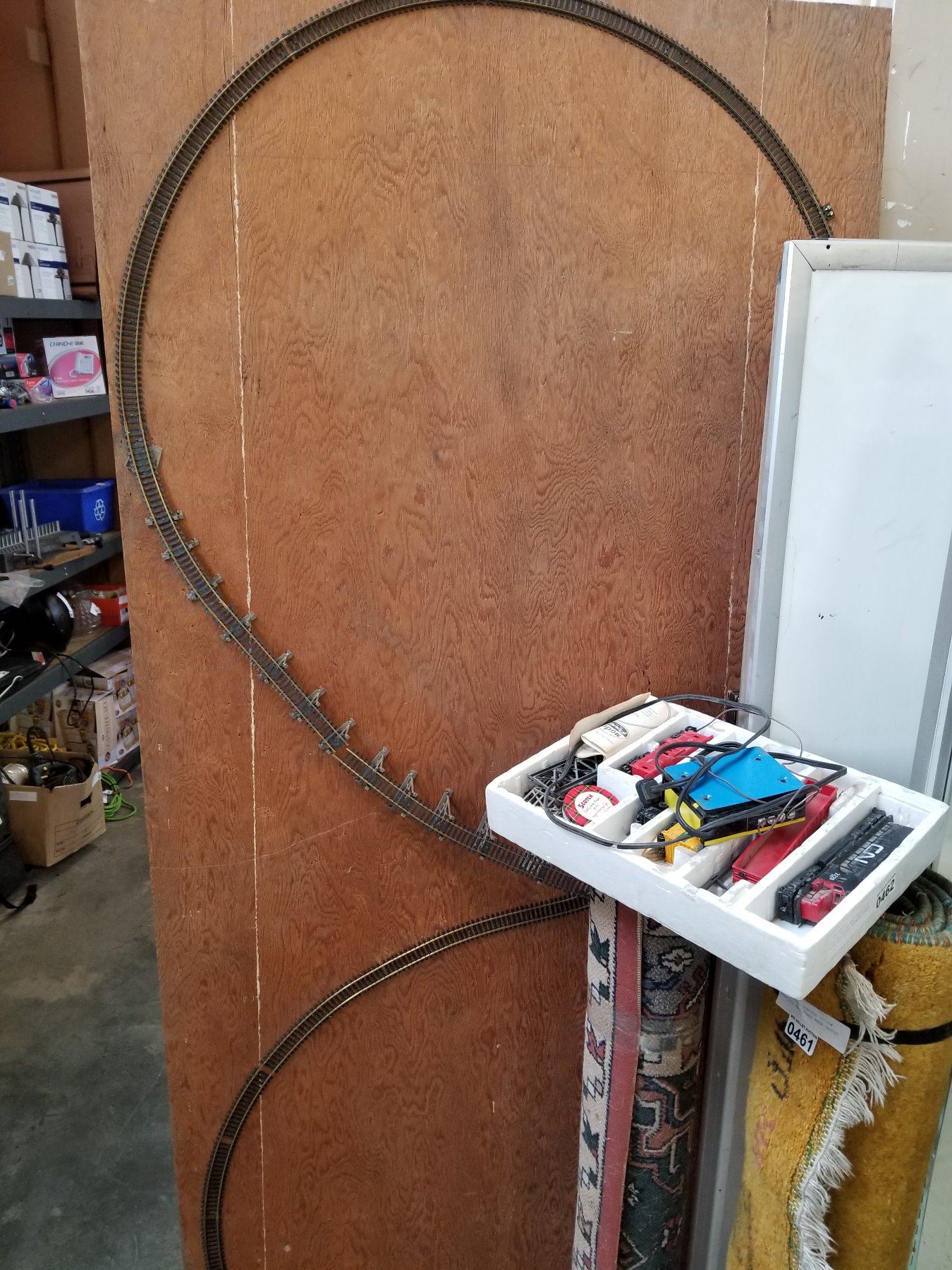 BOX OF TRAINS AND TRAIN CARS WITH 4FT x 8FT MOUNTED TRACK