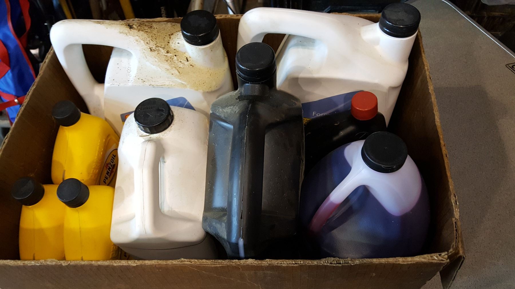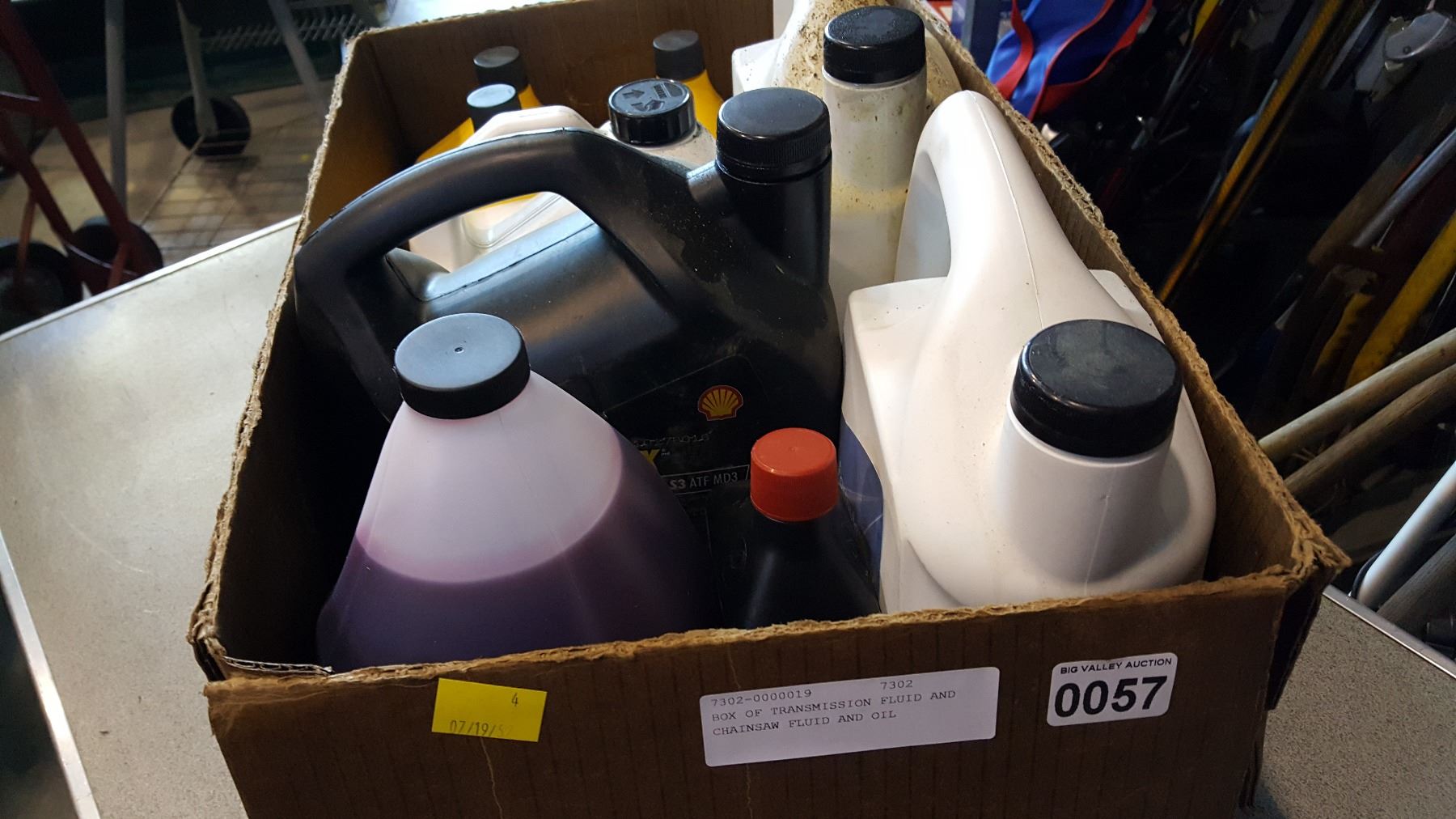 BOX OF TRANSMISSION FLUID AND CHAINSAW FLUID AND OIL