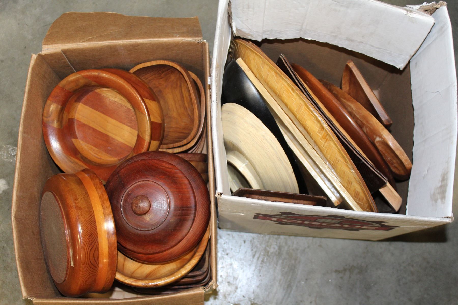 BOX OF TURNED WOODEN BOWLS AND BOX OF WOODEN DISHES