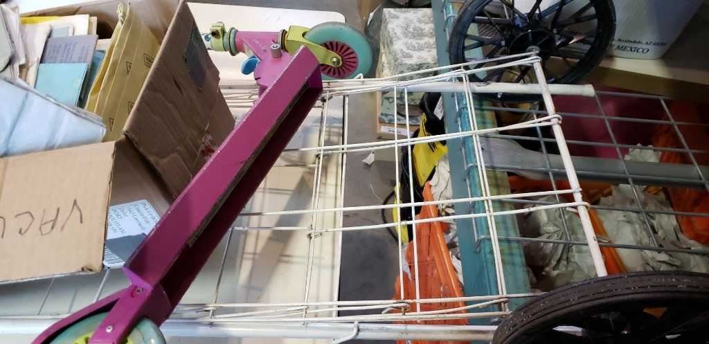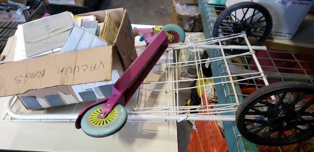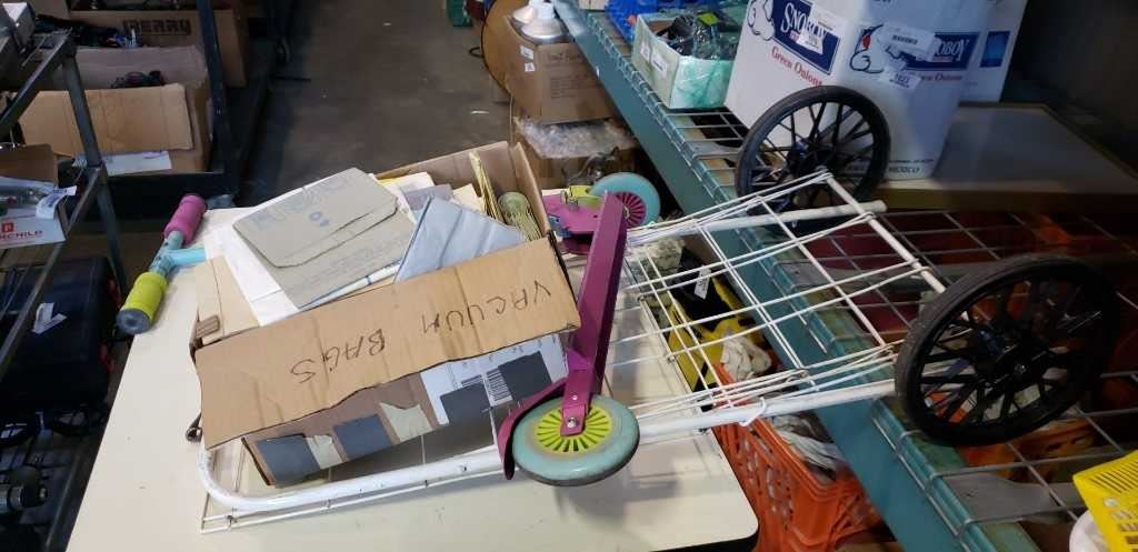 BOX OF VACUUM BAGS, SHOPPING CART AND SCOOTER