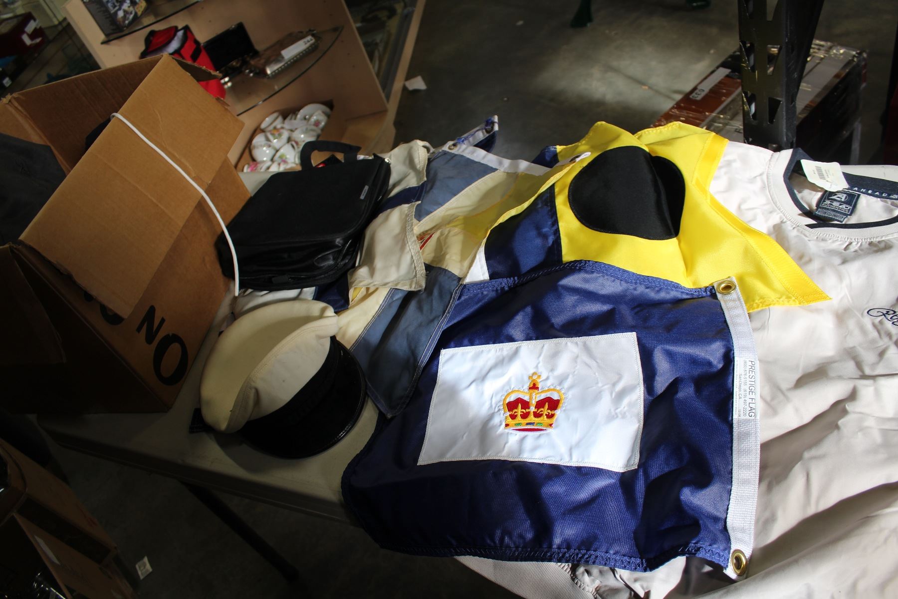 BOX OF VARIOUS BANNERS FLAGS HATS ETC