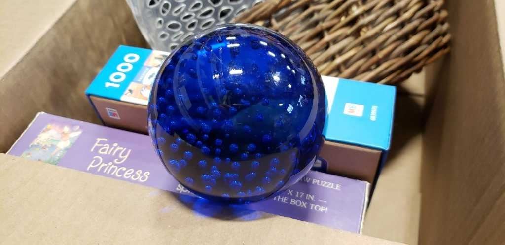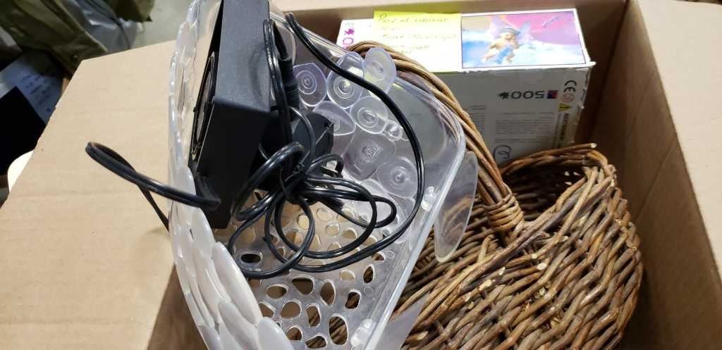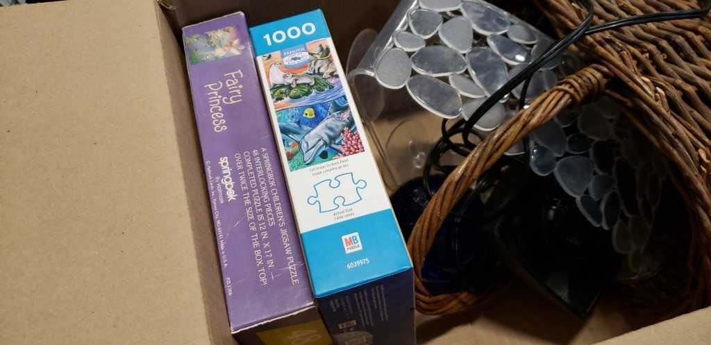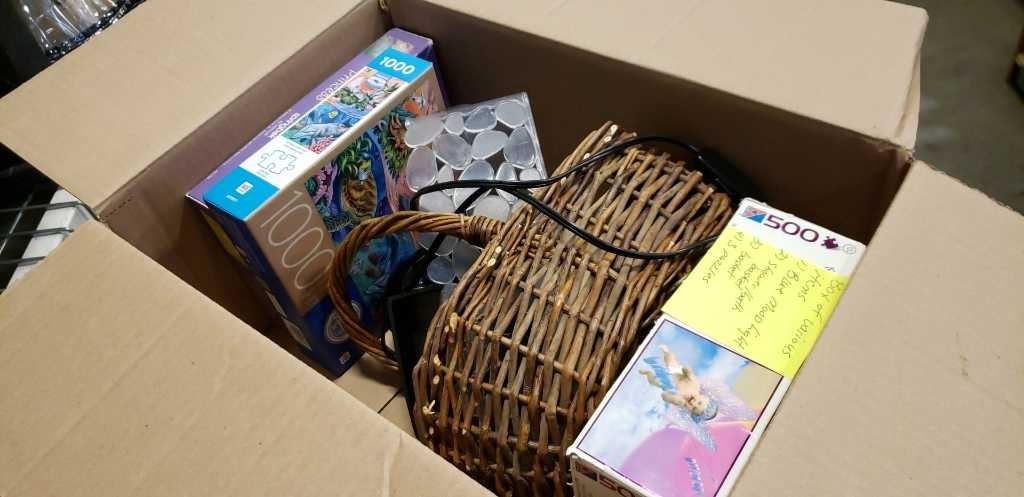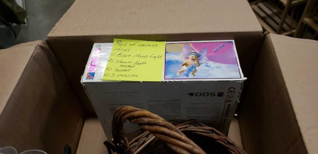 BOX OF VARIOUS ITEMS - MOOD LIGHT, BASKETS, PUZZLES, ETC