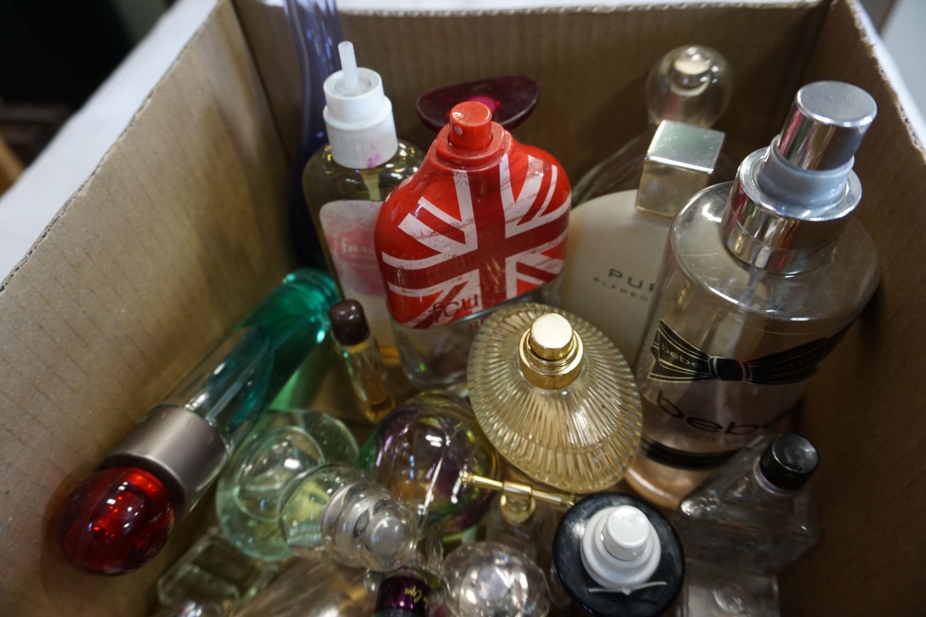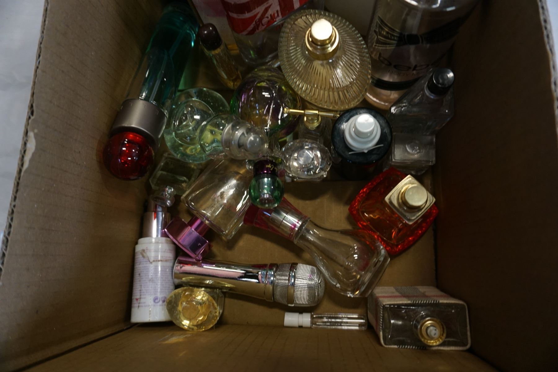 BOX OF VARIOUS PERFUME BOTTLES W/ CONTENTS