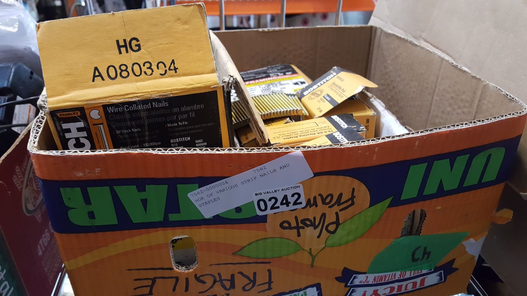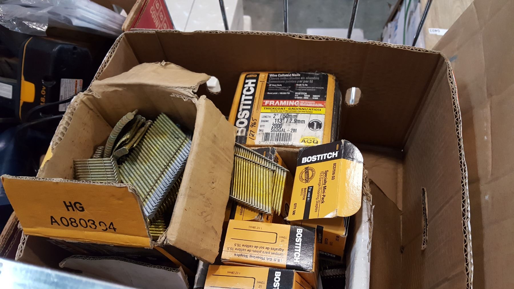 BOX OF VARIOUS STRIP NAILS AND STAPLES