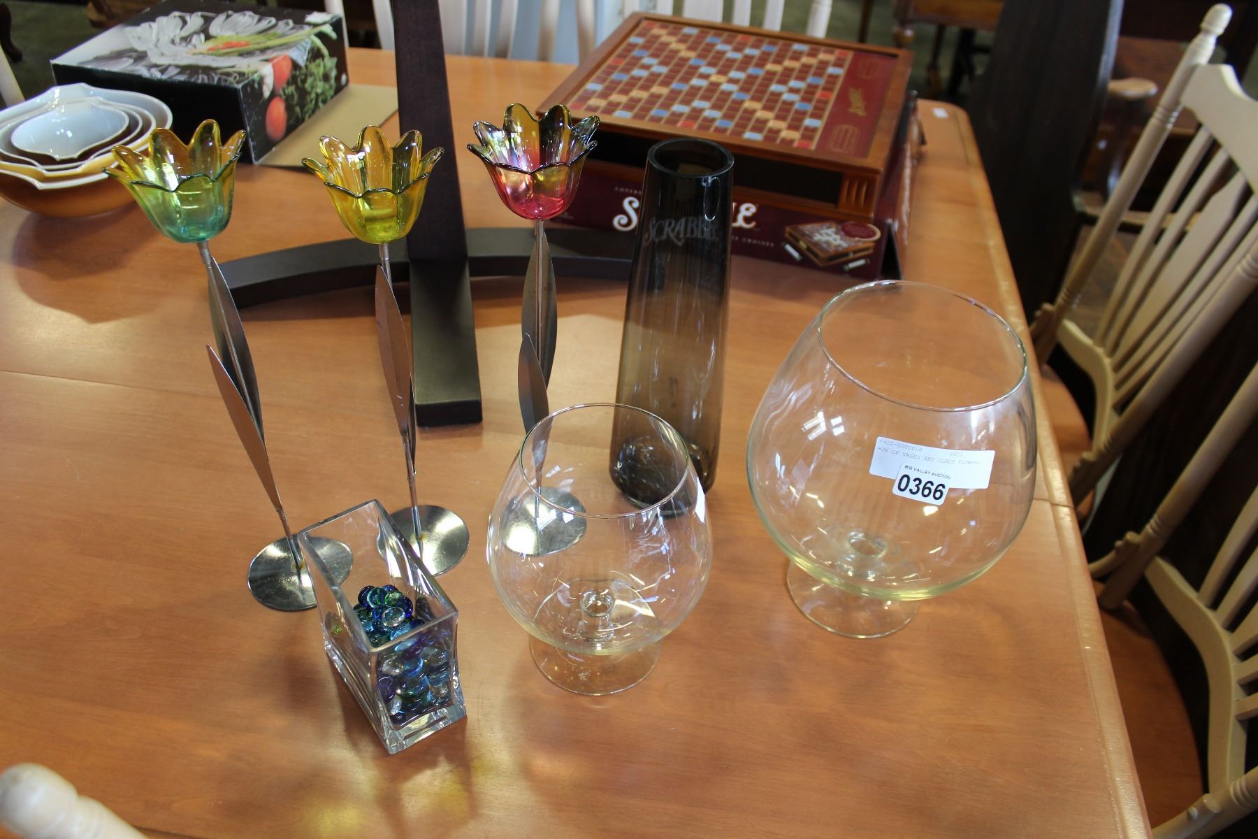 BOX OF VASES AND GLASS FLOWERS